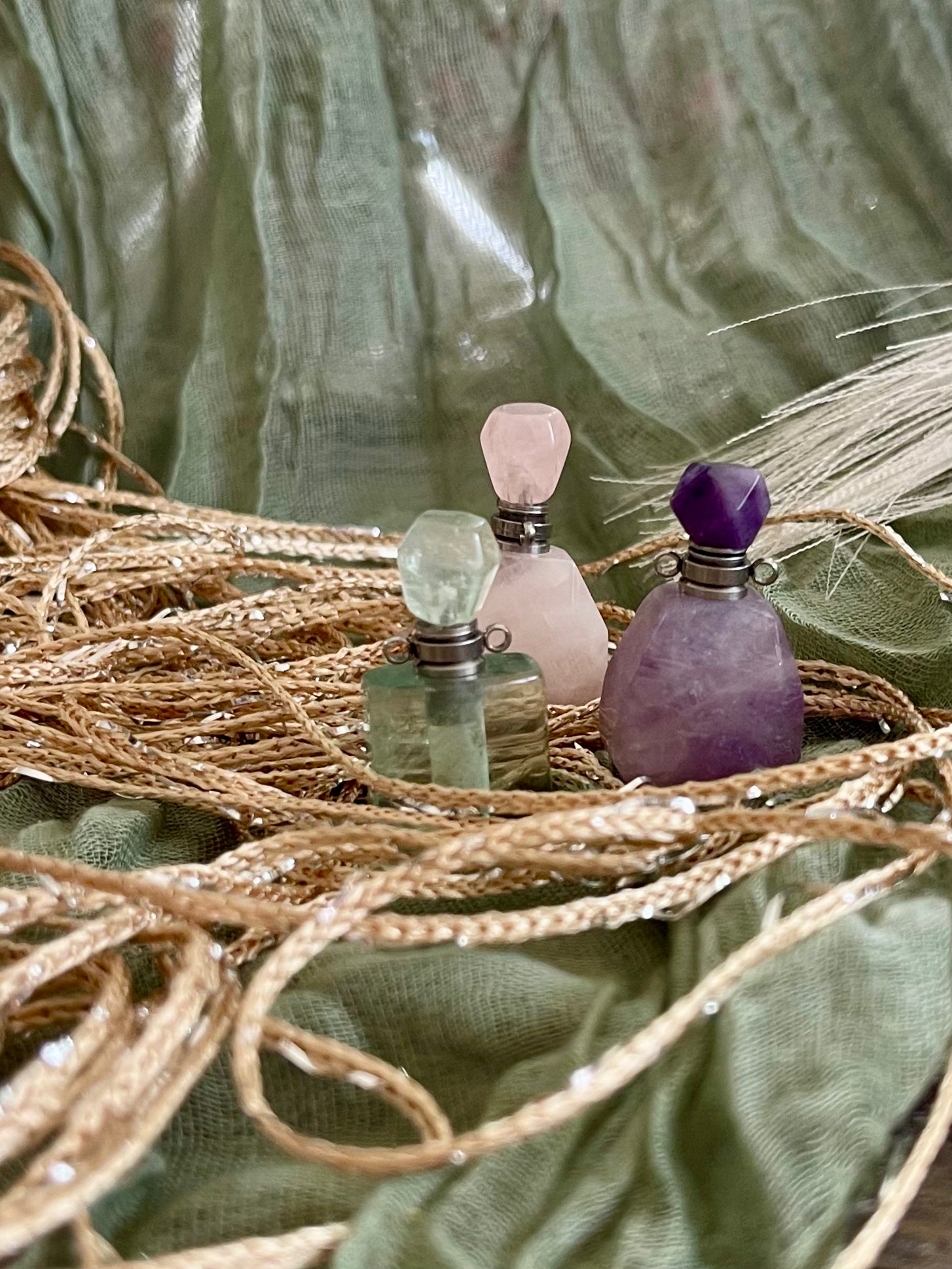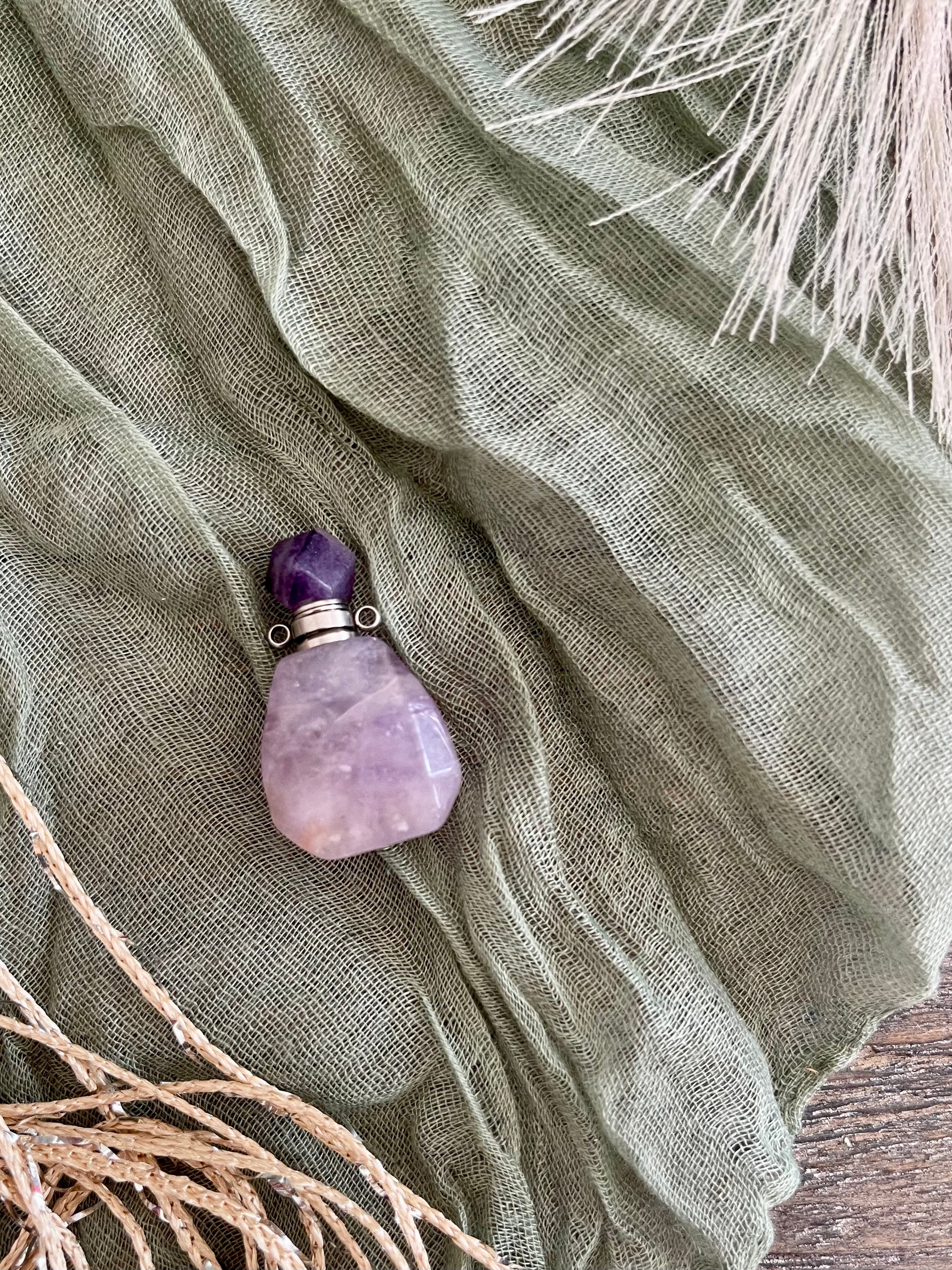 Add a touch of healing energy with this Amethyst Perfume Bottle. Twist top design allows for easy refill and personalization. Carry your favorite scent or essential oil wherever you go. Infused with the calming and healing properties of Amethyst.