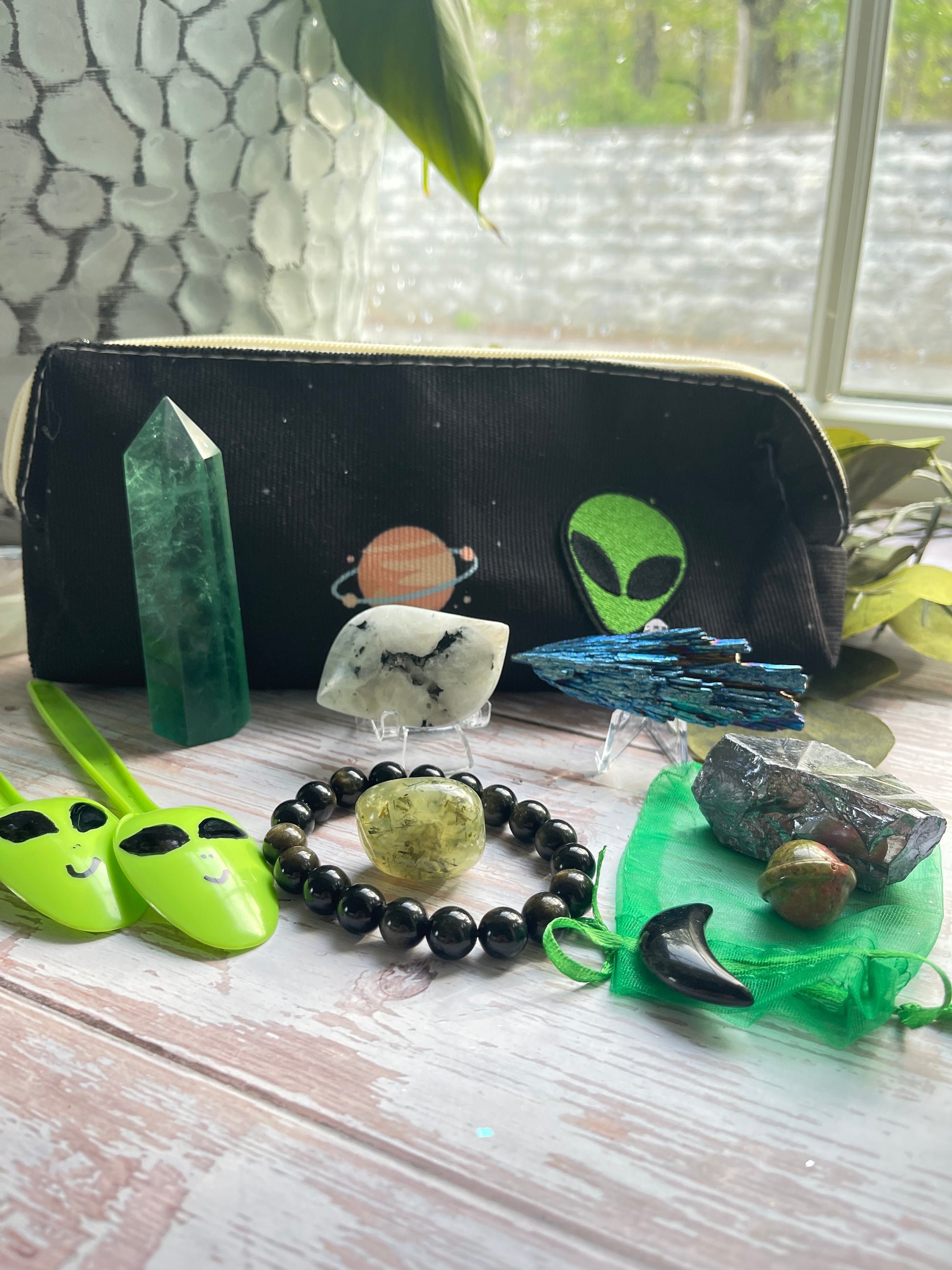 Green Fluorite Tower, Moonstone leaf or palm stone), small moon carving, small planet carving or other themed small carving, raw hematite, obsidian bracelet, aura or black kyanite, and your own baby alien spoons!