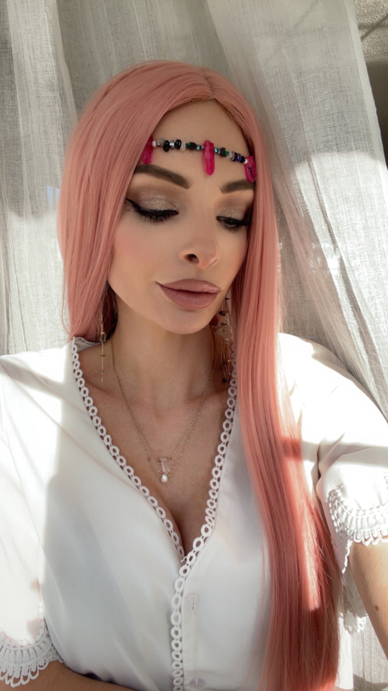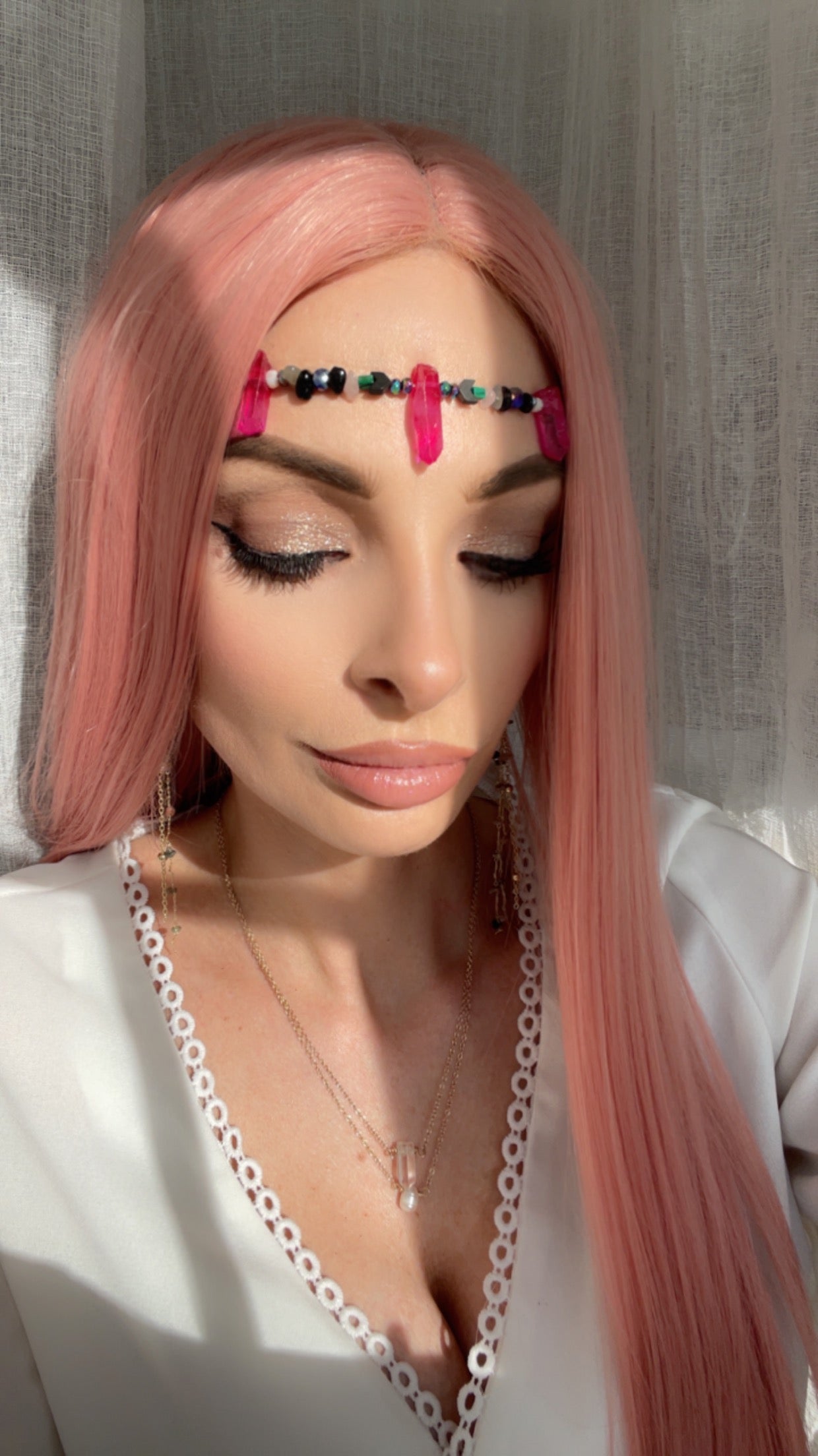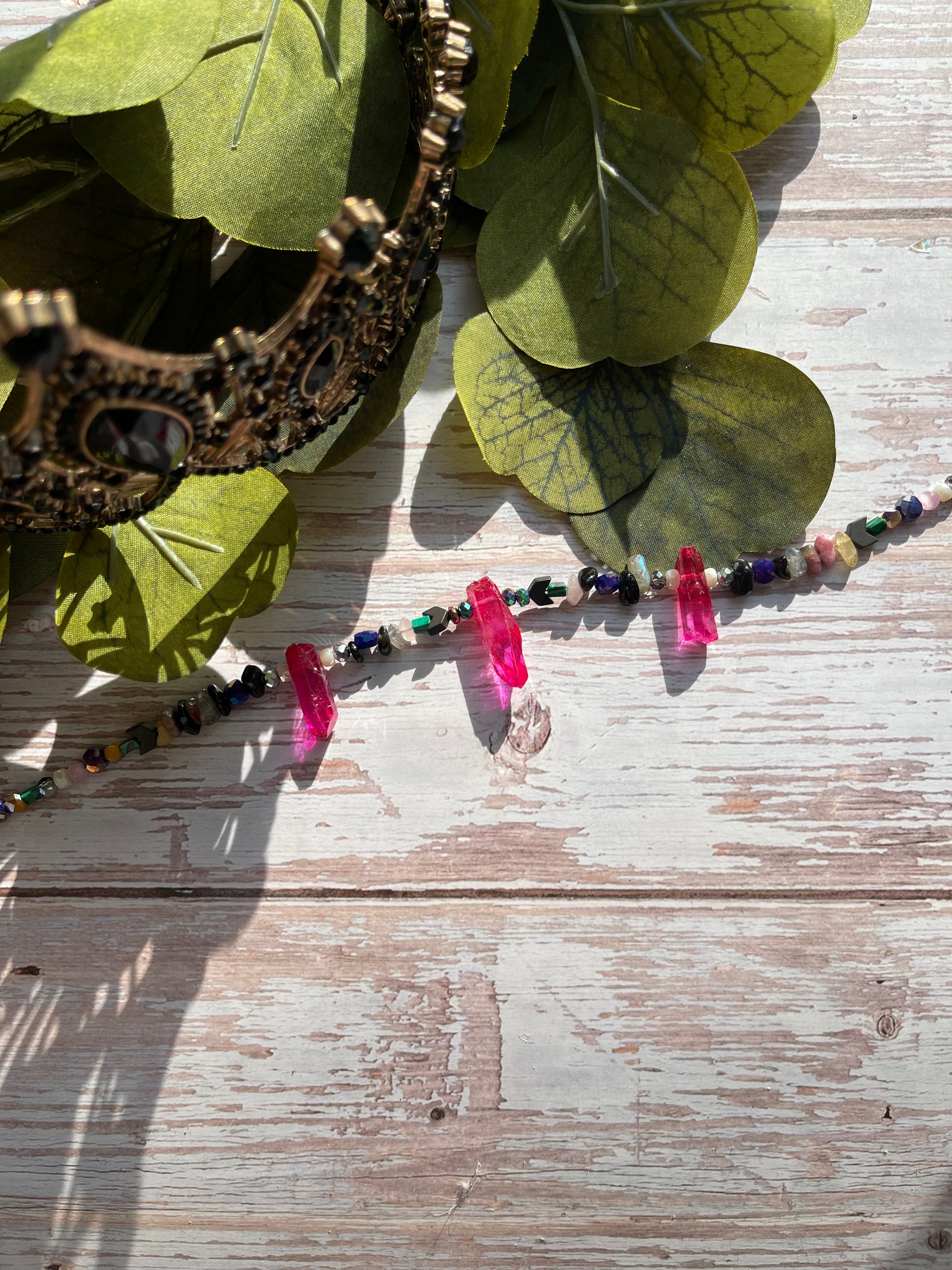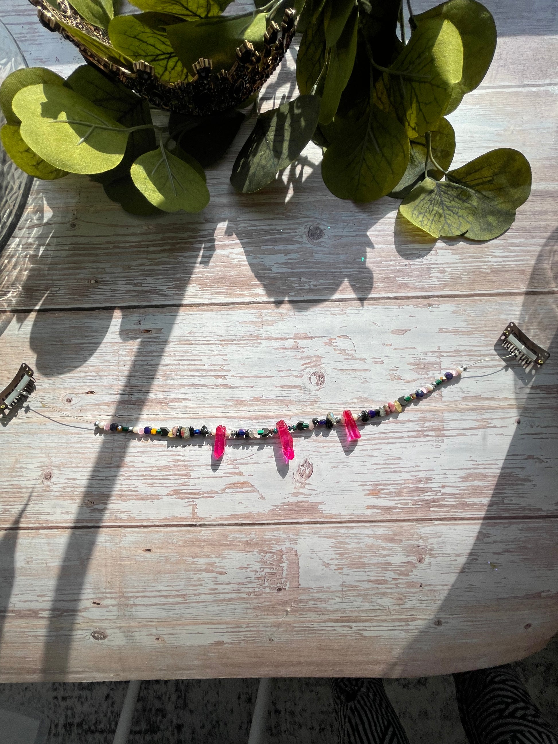 Hot pink aura clear quartz points, labradorite, black obsidian, rose quartz, malachite, glass beads