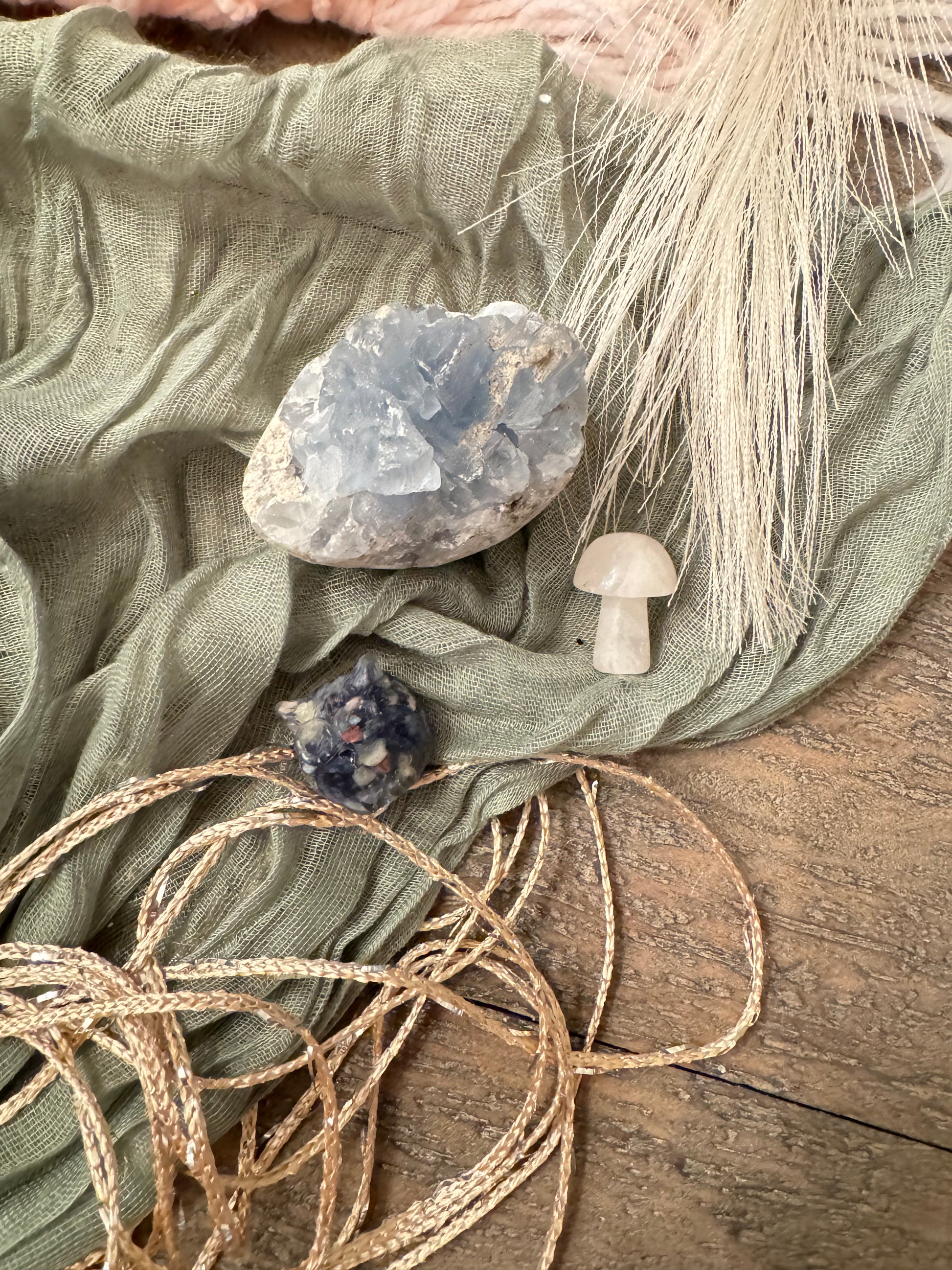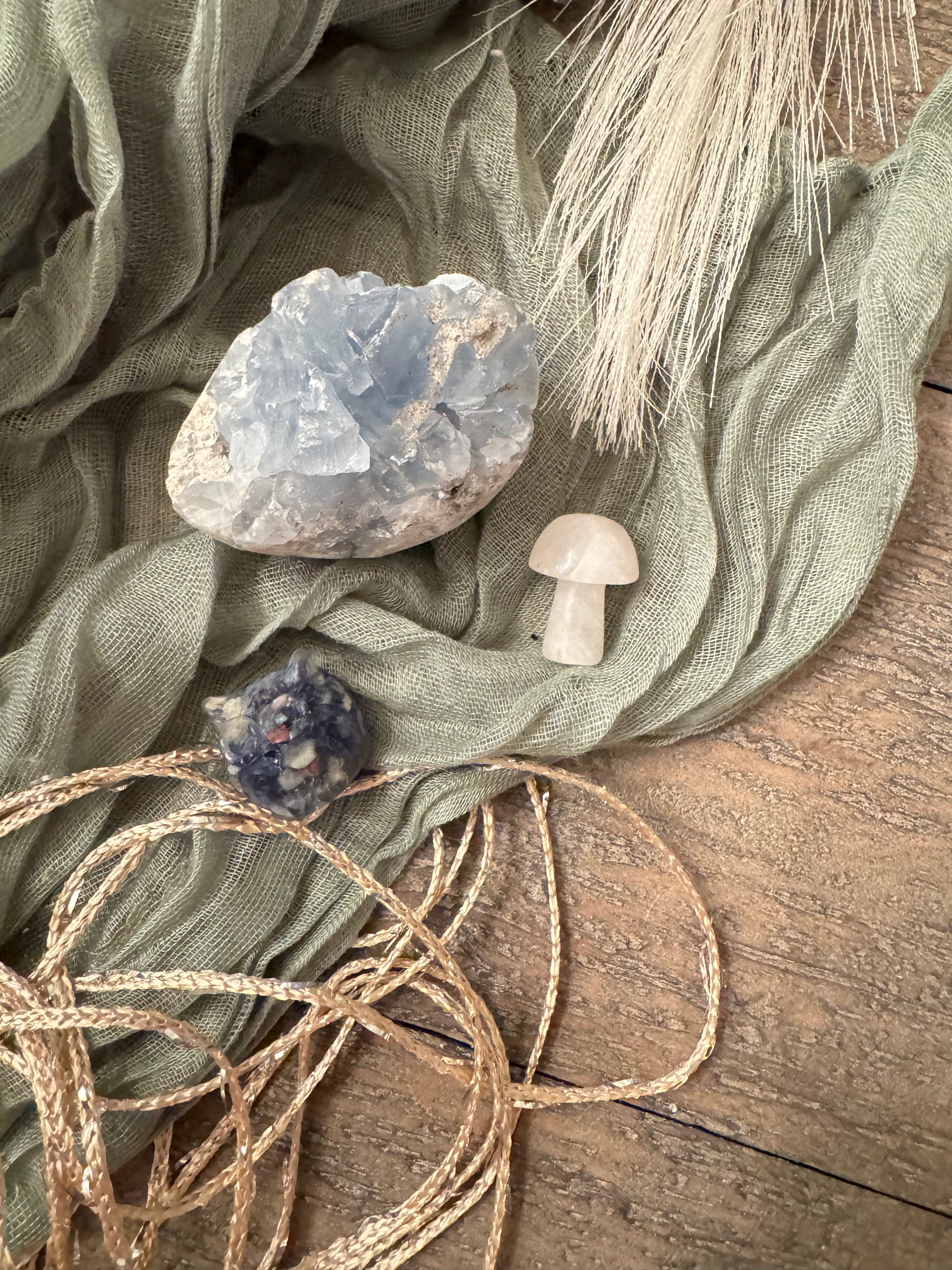 Unleash the healing powers of the Blue Celestite Enchanted Trio! This trio harnesses the soothing properties of blue celestite, sodalite (mini owl), clear Quartz mini mushroom and promotes inner peace and reduce stress. Elevate your well-being with this magical trio.