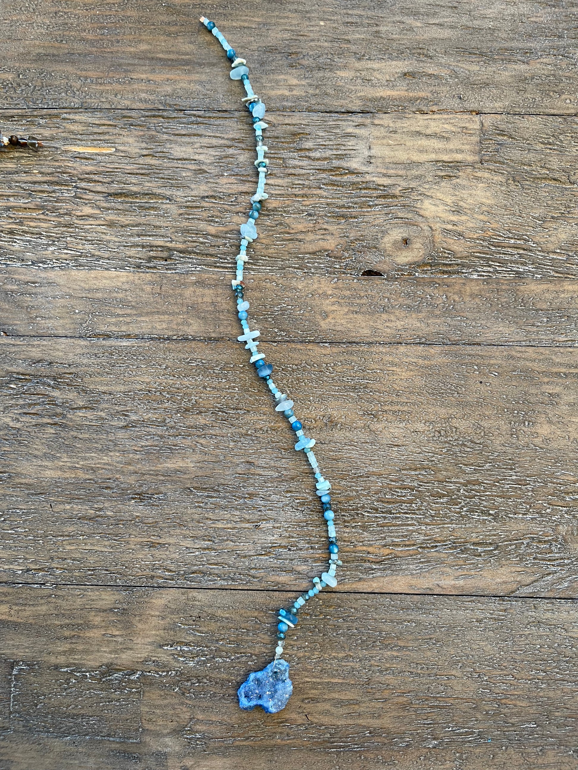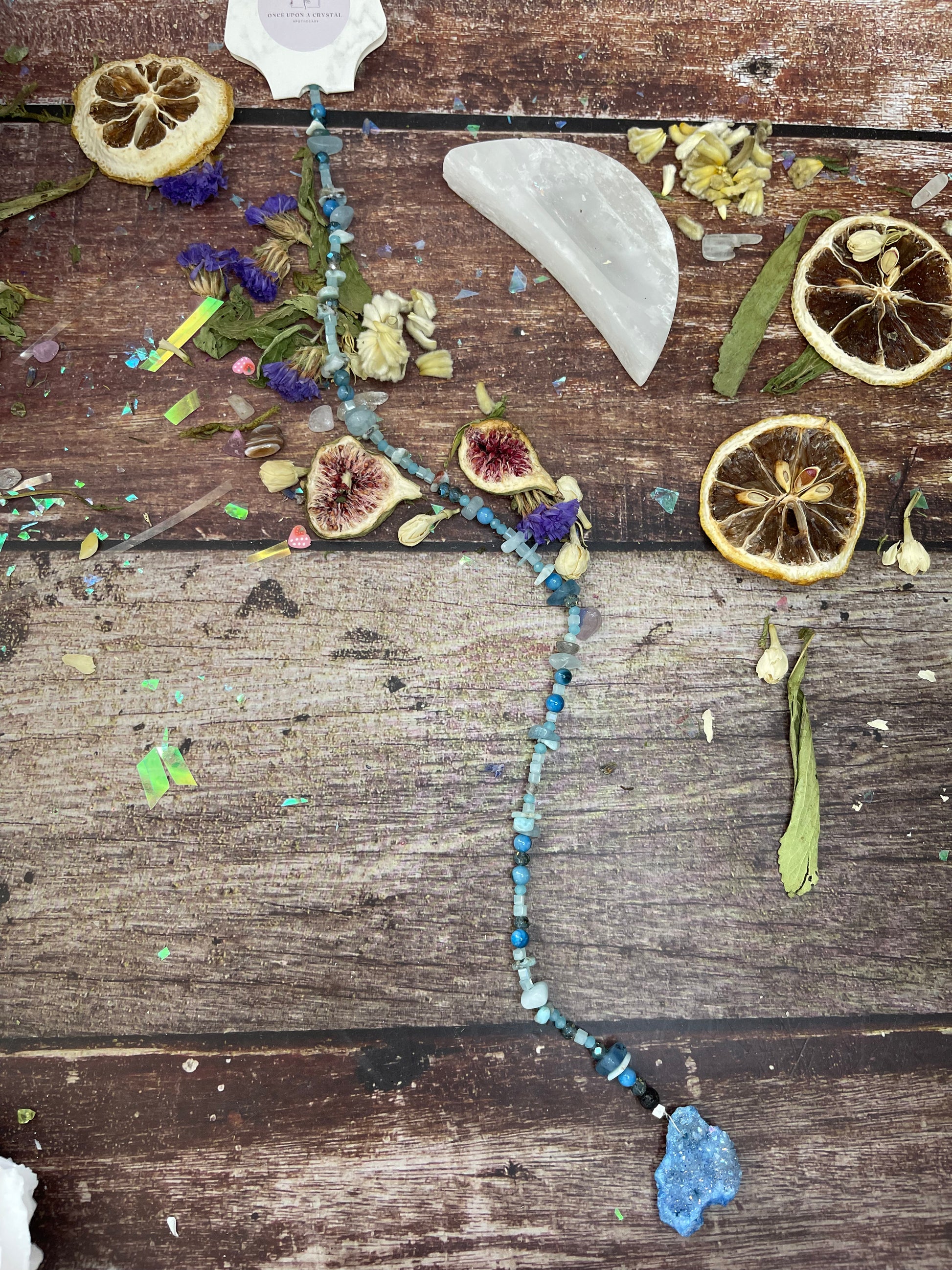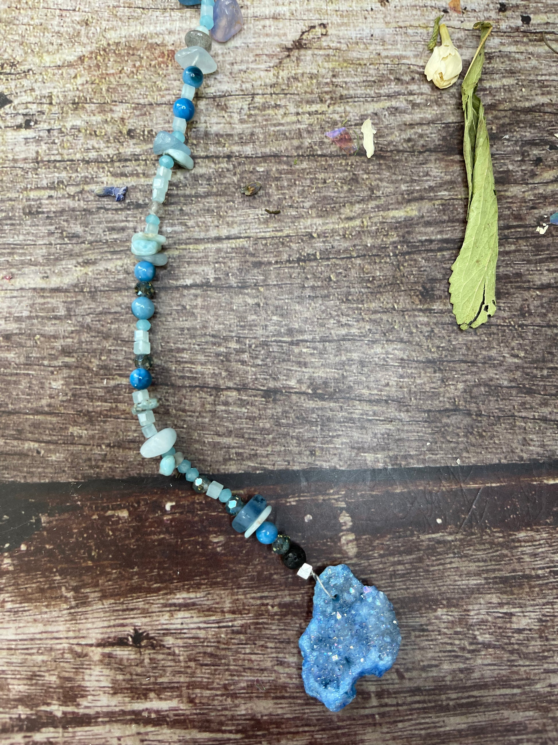 Crystals: Aquamarine, Blue Aventurine, Larimar, Labradorite, Glass Beads, Lava Stone, Color Enhanced Blue Druzy Agate Geod