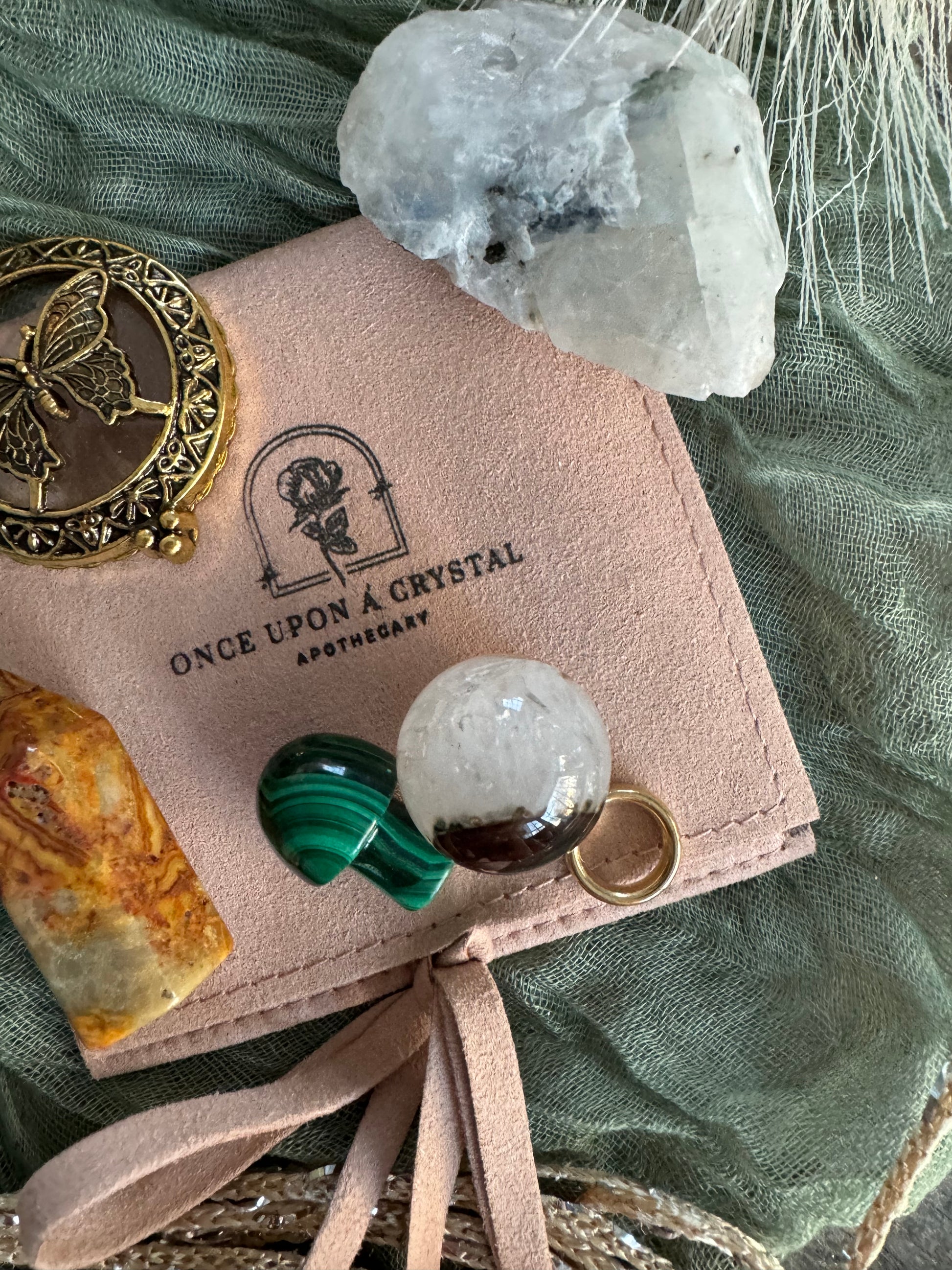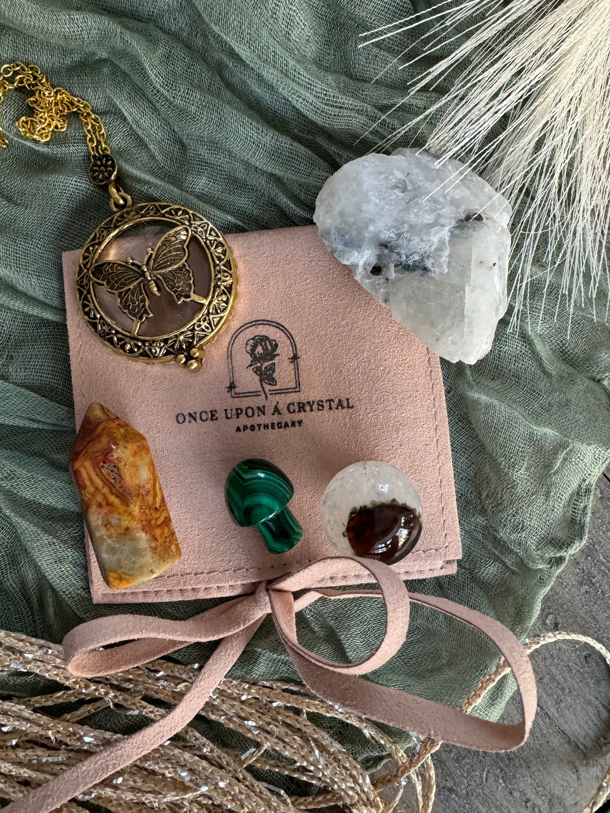 Set includes: small black agate sphere, High-quality malachite mushroom, A butterfly necklace that actually turns into a magnifying glass, raw rainbow Moonstone, And a mini crazy lace agate tower. I’m obsessed with this little set that has such great energy!