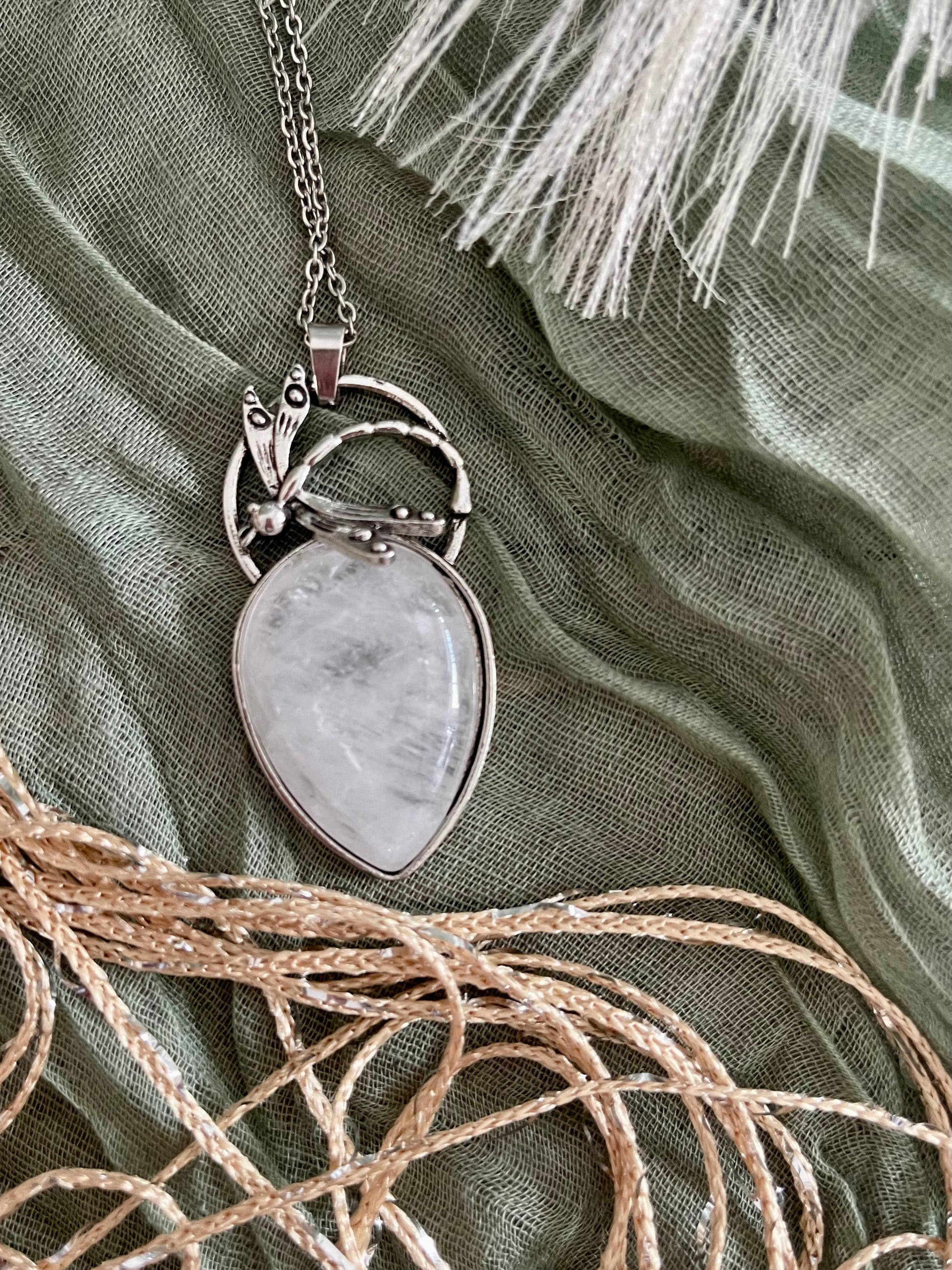 Discover the healing properties of Clear Quartz with this beautiful Dragonfly Necklace. The teardrop shaped stone, accented by a delicate dragonfly, invites balance and harmony into your life. Let this necklace be a reminder to embrace the powerful benefits of this gemstone.