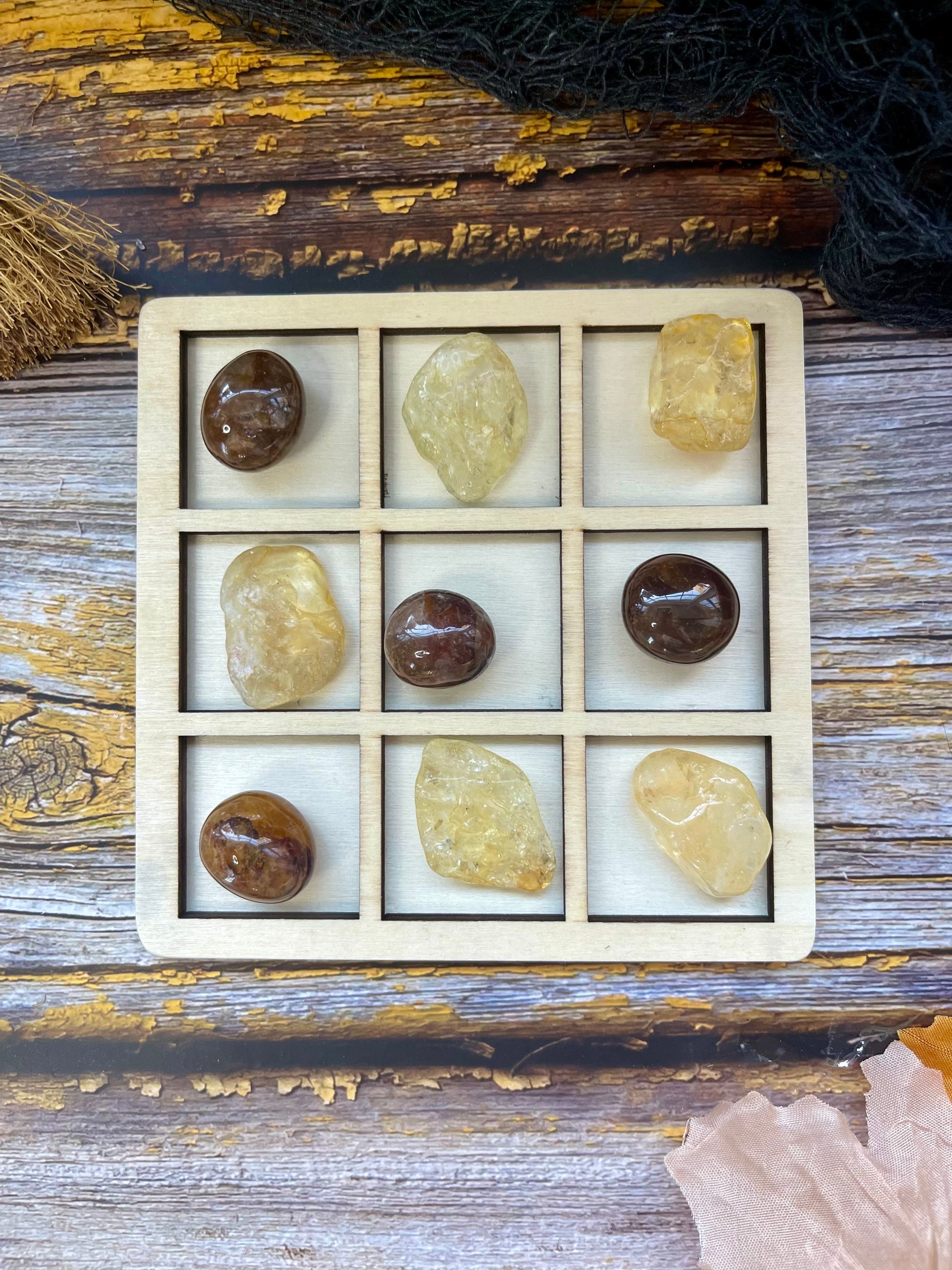 This elegant crystal tic tac toe set features stunning fire quartz and citrine pieces, adding a touch of natural beauty to the classic game. The fire quartz is known for its energizing and protective properties, while citrine promotes creativity and abundance. Perfect for both play and display.