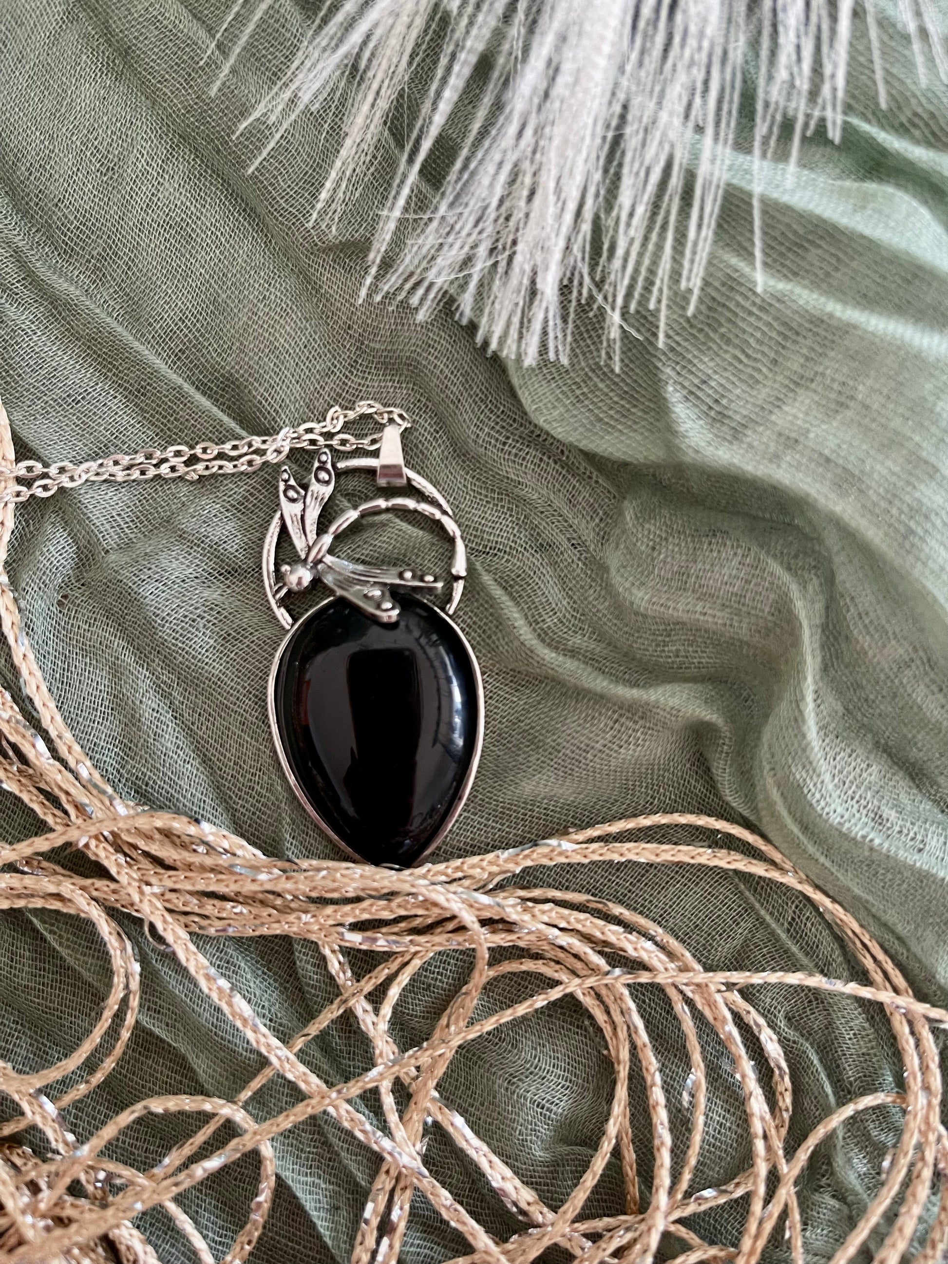 This beautiful Black Obsidian Dragonfly Necklace features a teardrop-shaped black obsidian stone with a delicate dragonfly on top. With its calming and grounding healing properties, this necklace is a perfect addition to any outfit. Find balance and positive energy while wearing this unique piece.