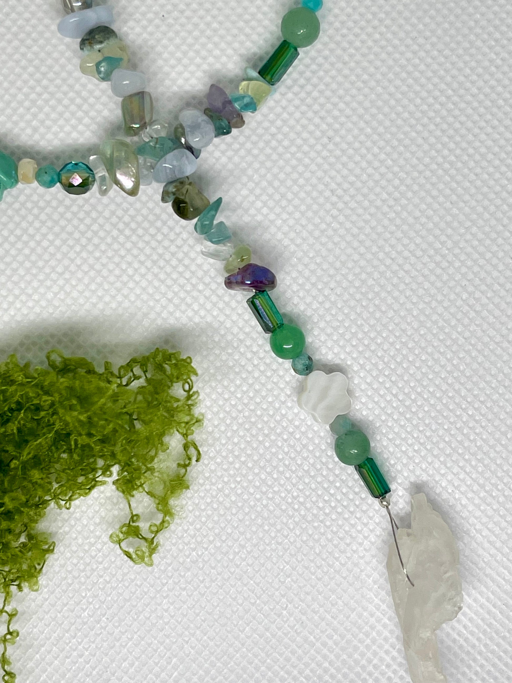 Each Seafoam Enchanted Crystal Hair Extension is handmade personally by me and includes Lava Stone - fluorite - Aura Coated Fluorite -Opalite (man made crystal)-Labradorite- Amazonite-Prehnite-Green Aventurine-Teal Rose and Shell Flower Shaped Beads- Blue Apatite-Larimar-Blue Lace Agate-Aura Coated Clear Quartz Point (these differ in length and appearance) Great for manifesting, protection, balance, love, and good luck!