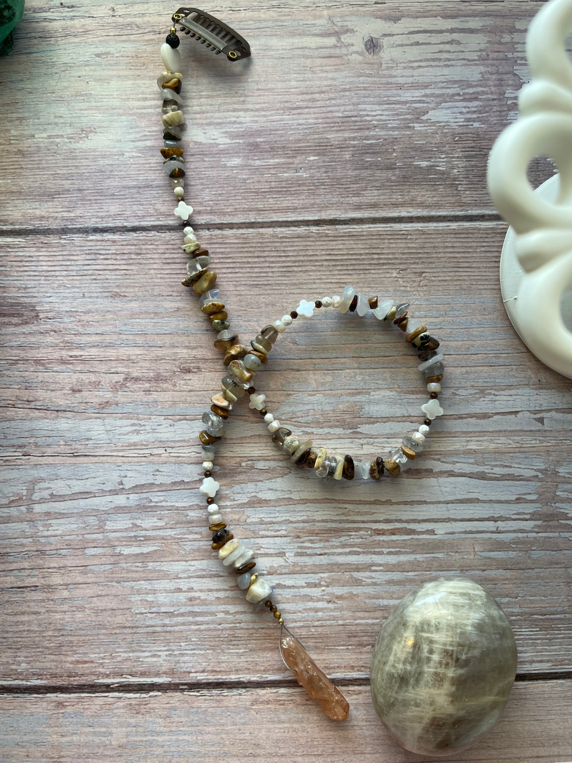 Named after one of our ASMR moderators, each Taylor’s Enchanted Forest Enchanted Crystal Hair Extension is handmade personally by me and includes Lava Stone - Leopard Skin Jasper - Picture Jasper -Tiger’s Eye-Labradorite- Fuzzy Bear and Glass Mushroom Beads- Garnet-Citrine- Wooden Round Beads Smoky Quartz-Aura Coated Clear Quartz Point (these differ in length and appearance) Great for manifesting, protection, balance, love, and good luck!