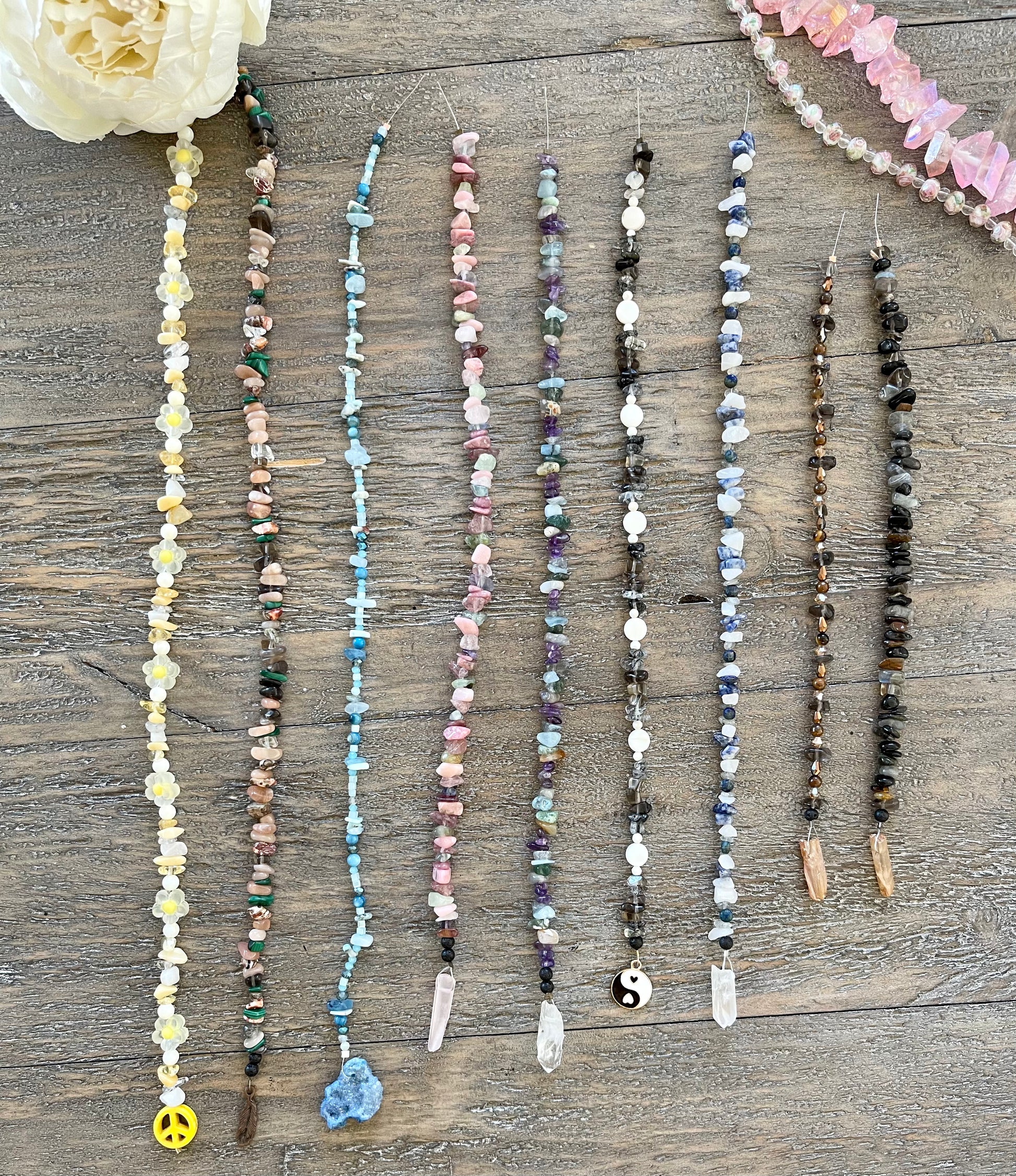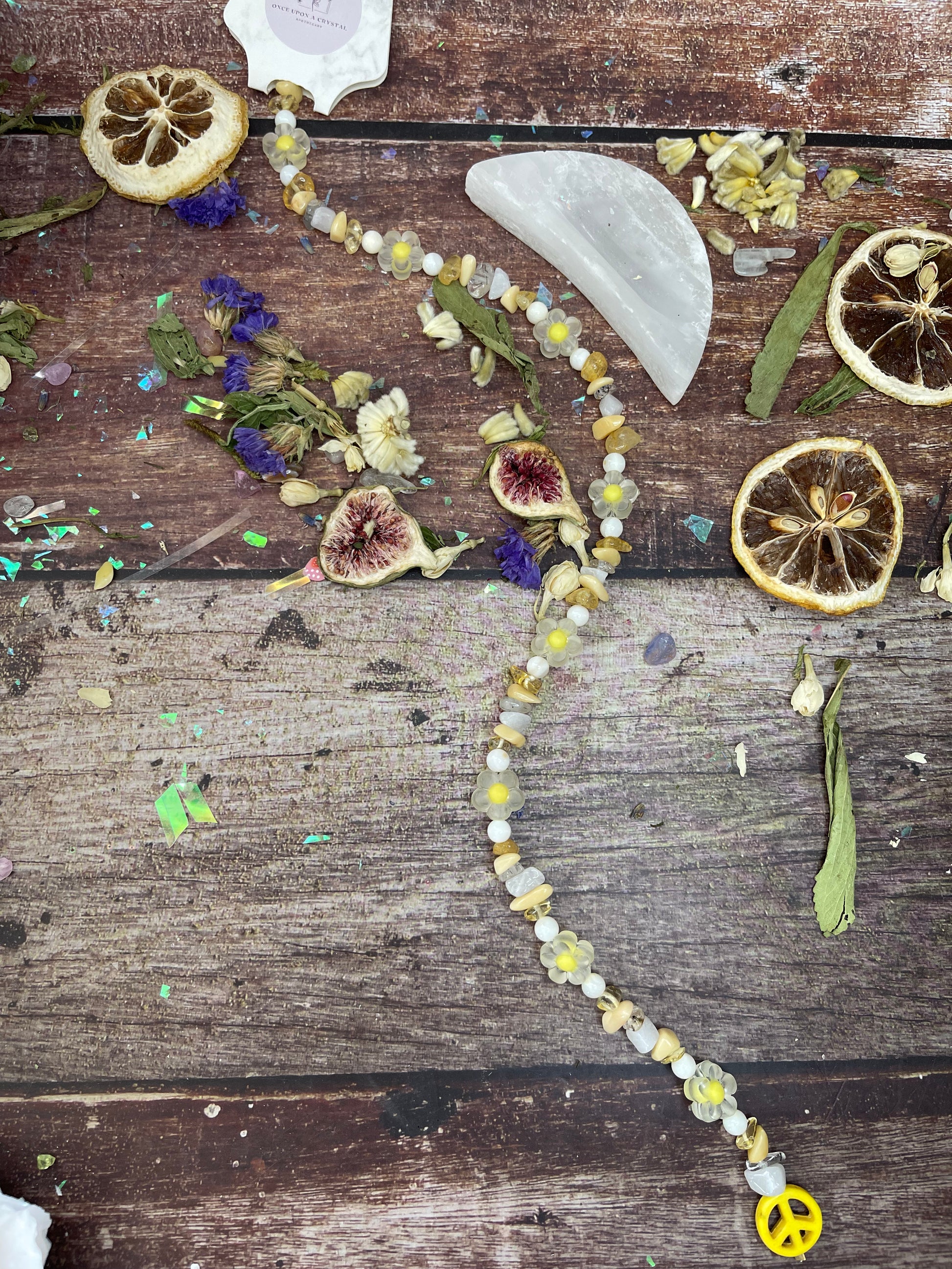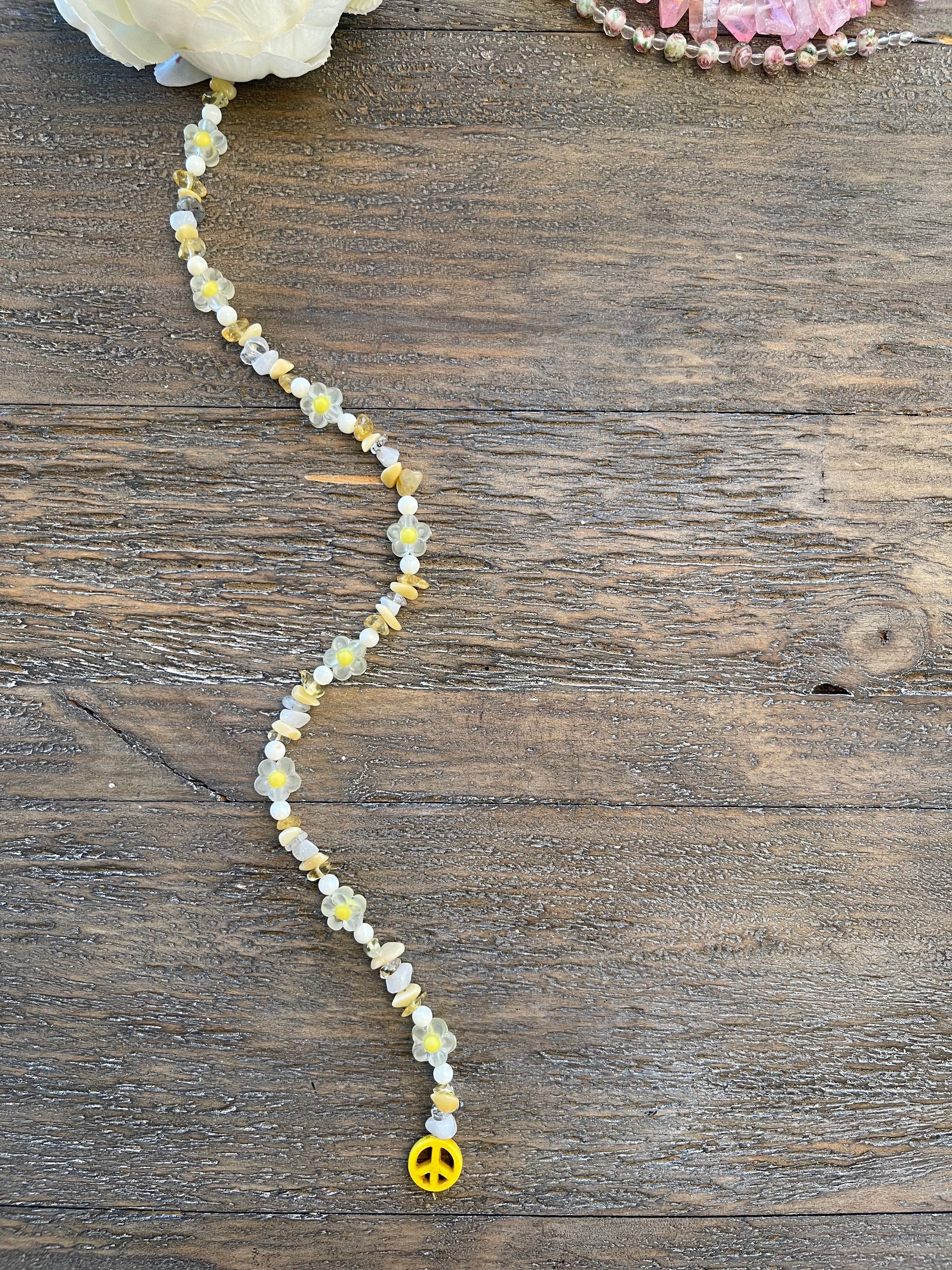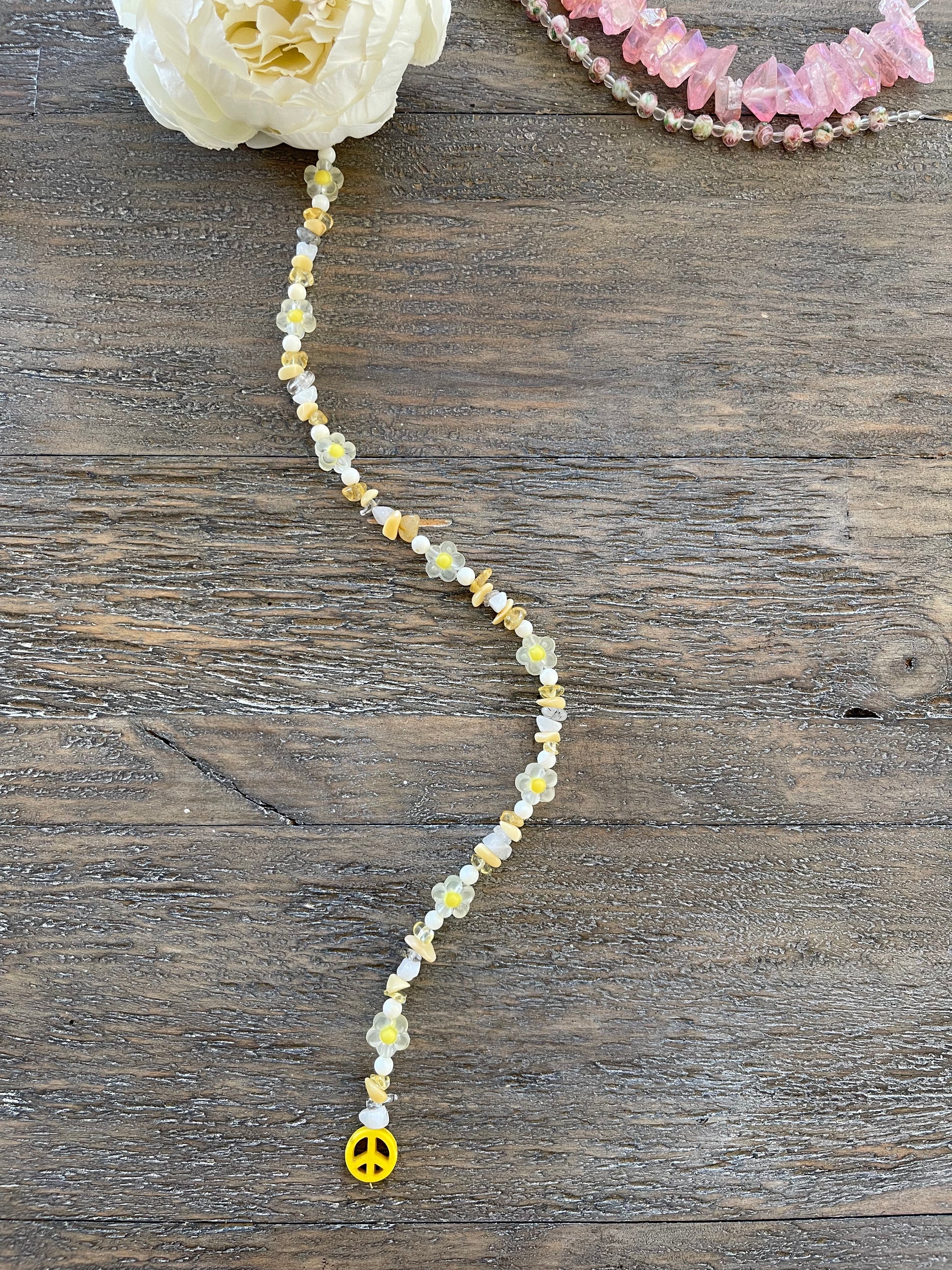 Crystals: Lava Stone, Yellow Jade, Citrine, Shell, Flower Bead, Clear Quartz, Milky Jade, Clay Peace Sign.