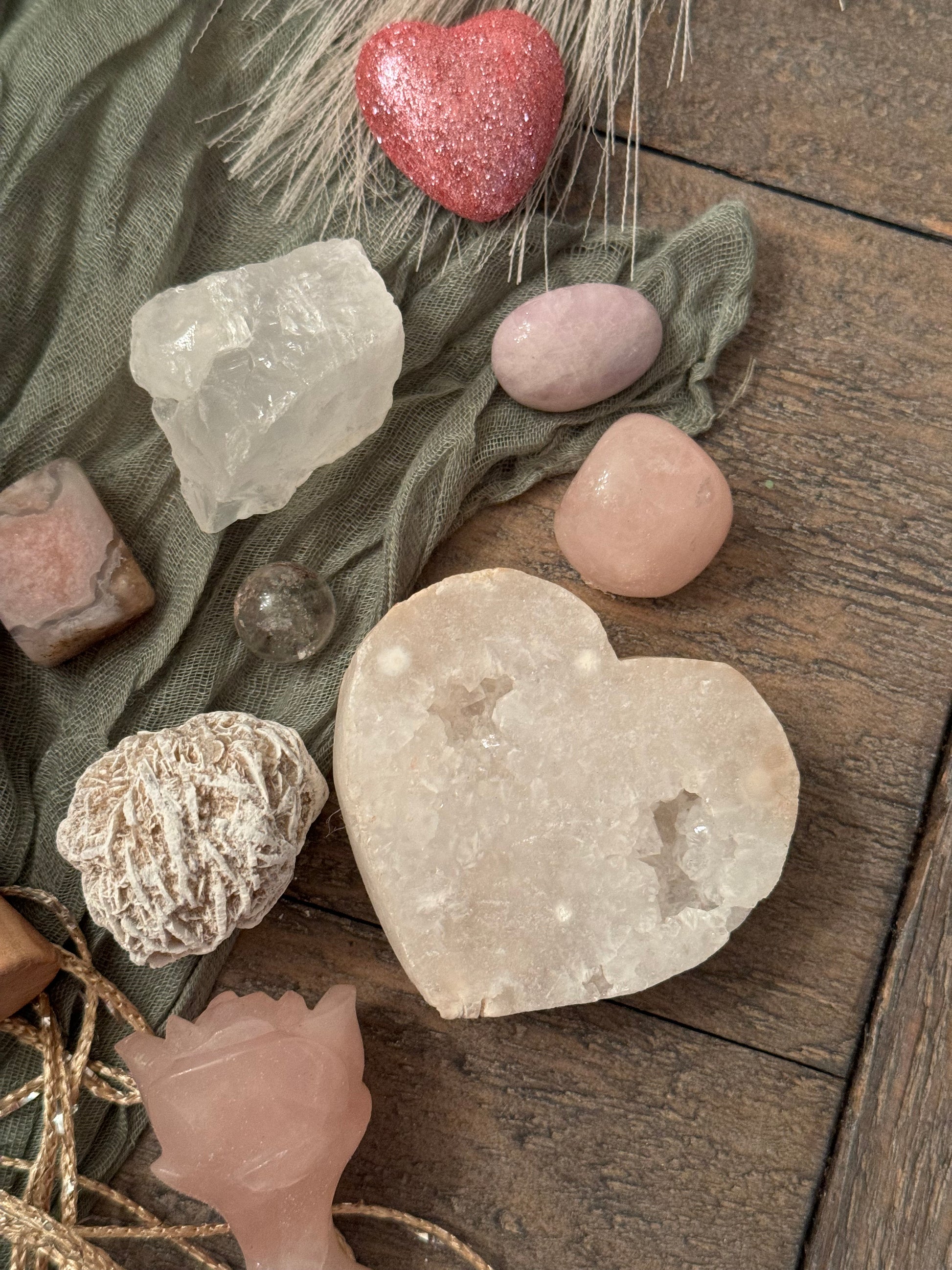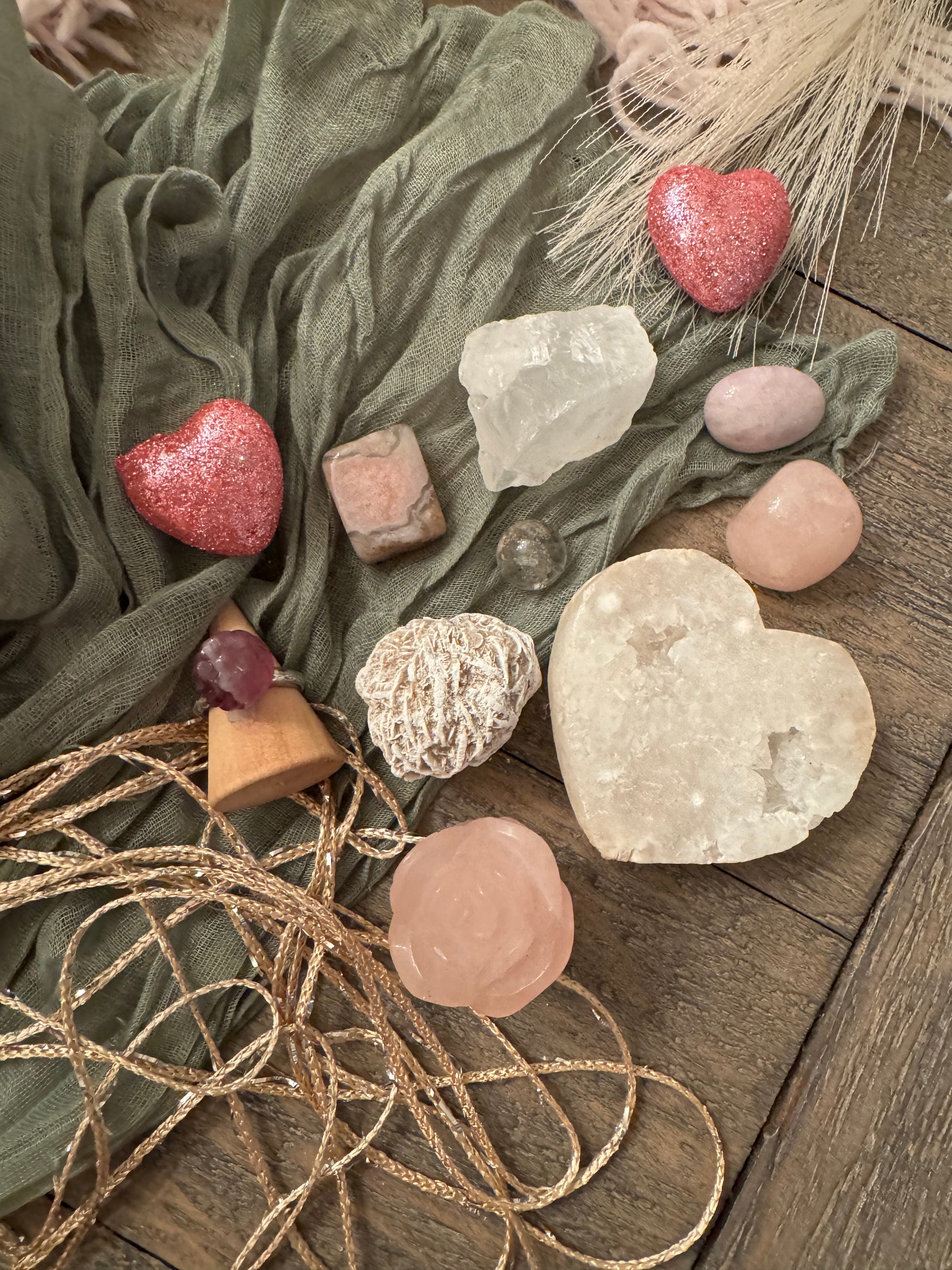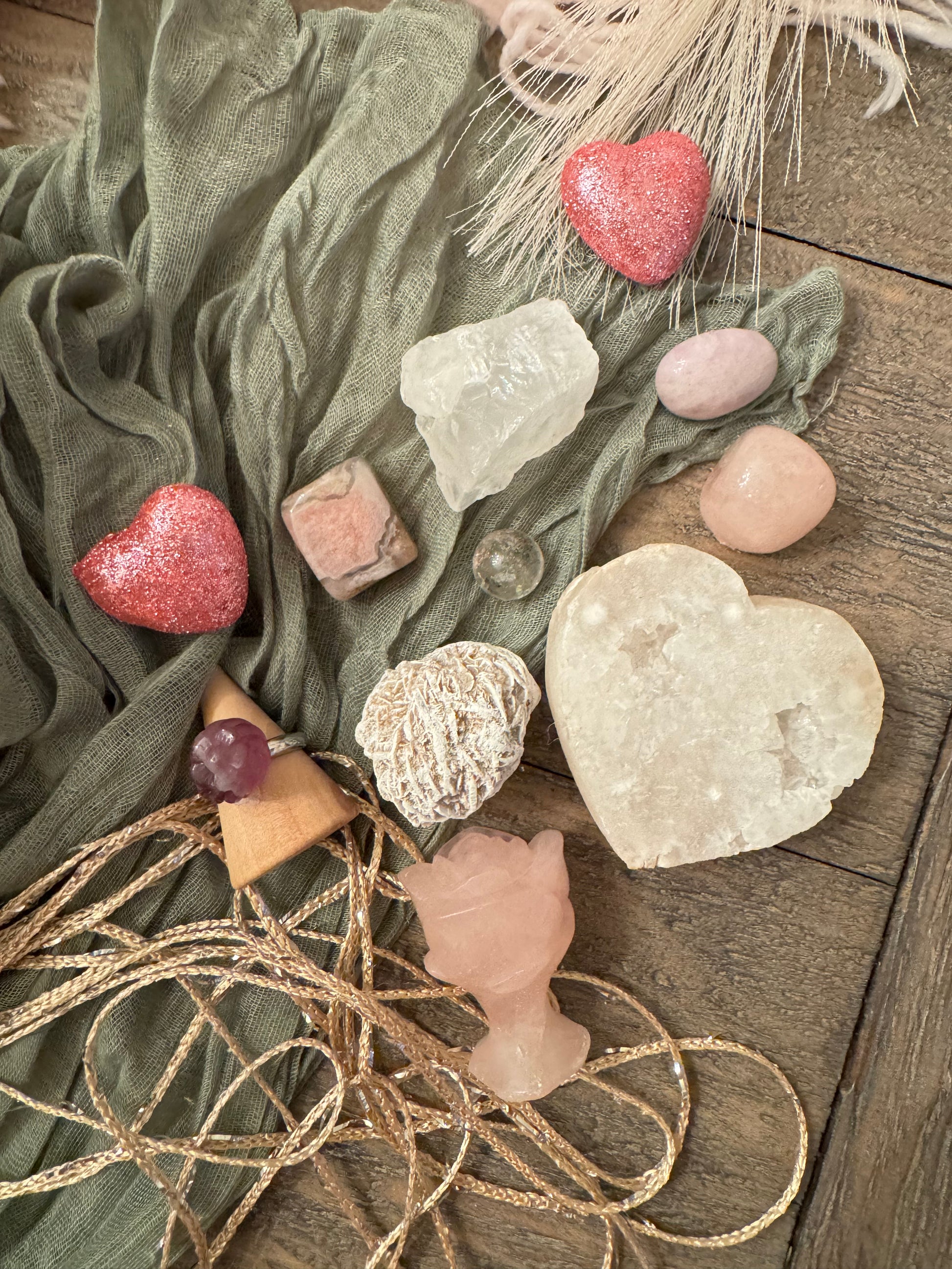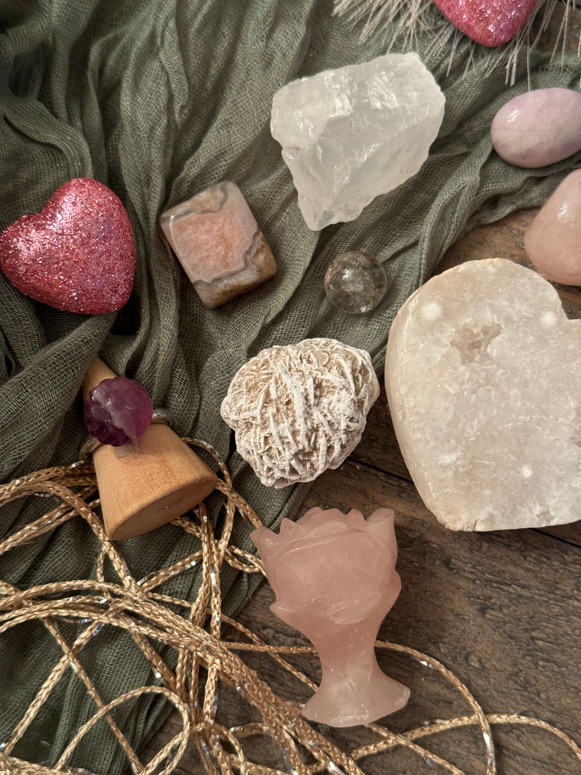 Bundle includes Desert Rose, Rose Quartz Rose, Druzy Mexican White Agate geod heart, mini Garden Quartz sphere, raw Clear Quartz, Fluorite Rose adjustable ring, Rose Quartz Tumble, Flower Agate Cube, Kunzite tumble all in a cute little box.