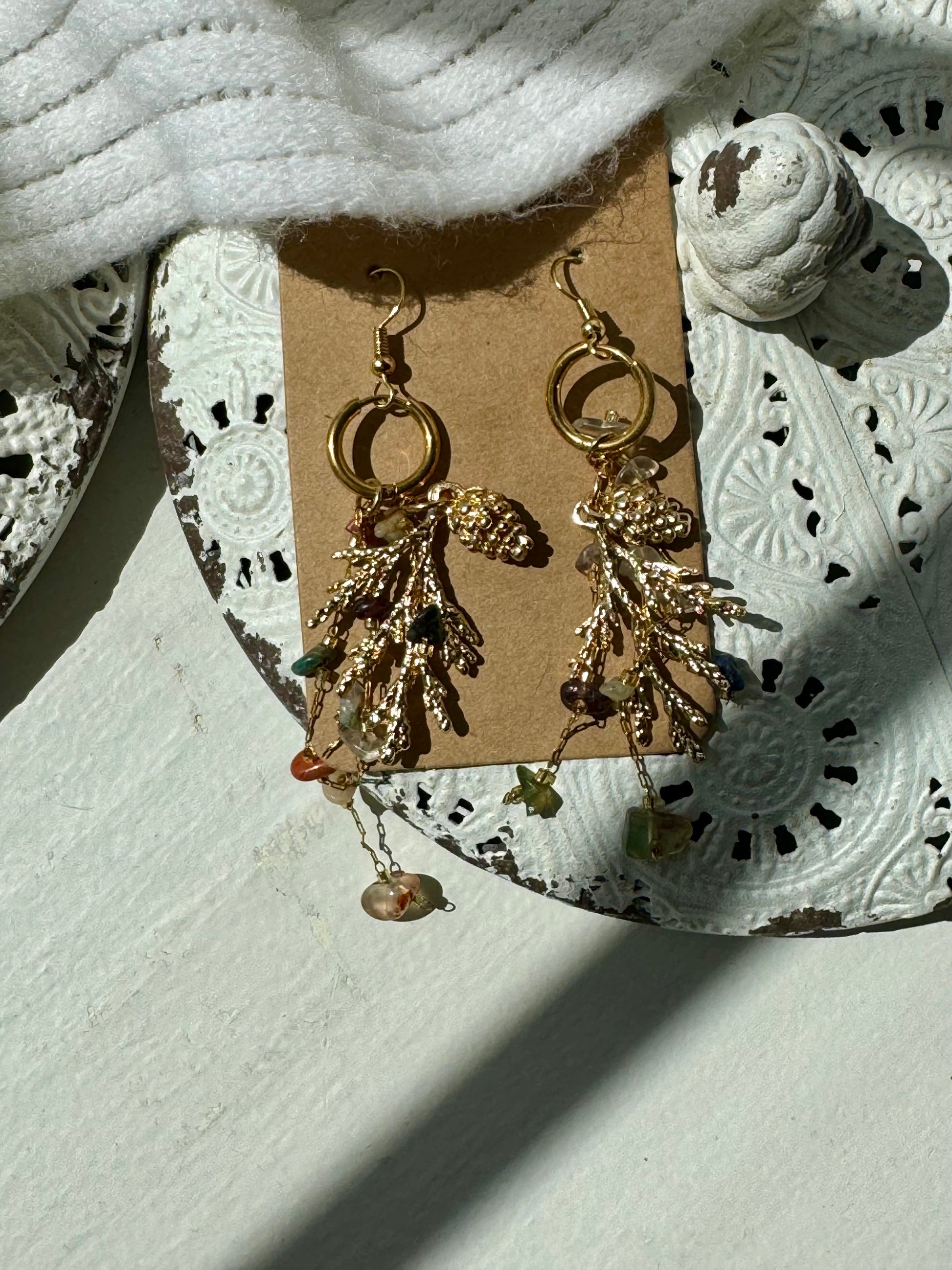 Please avoid exposing your jewelry to water, lotions, perfumes, or excessive moisture, as this can compromise both the finish and the integrity of the stones. Rough handling may cause crystals to loosen or fall out.