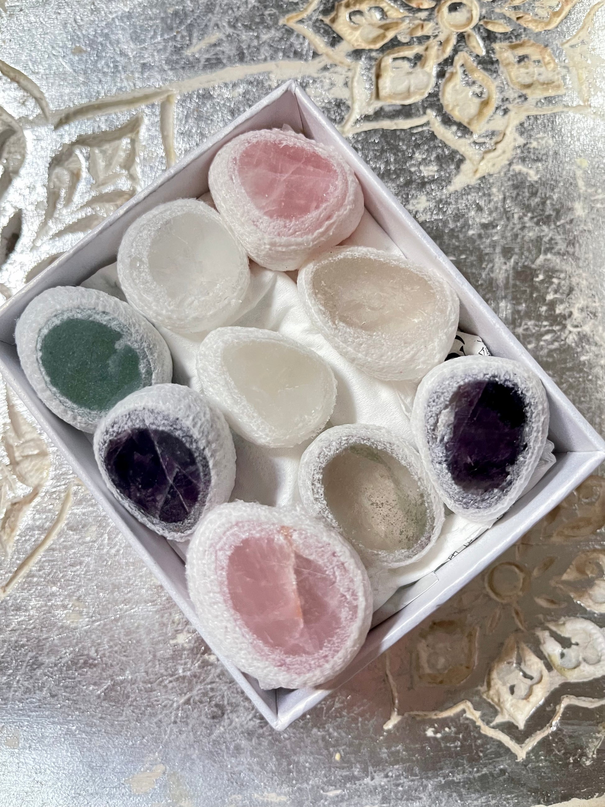 I'm obsessed with these little cutie crystal Emma Eggs, also known as Seer Stones or Ema River Stones. These oval-shaped, naturally polished stones from Brazil have a "window" cut on one side, offering a glimpse into the past or future. Perfect for anyone seeking insight and a touch of luxury.