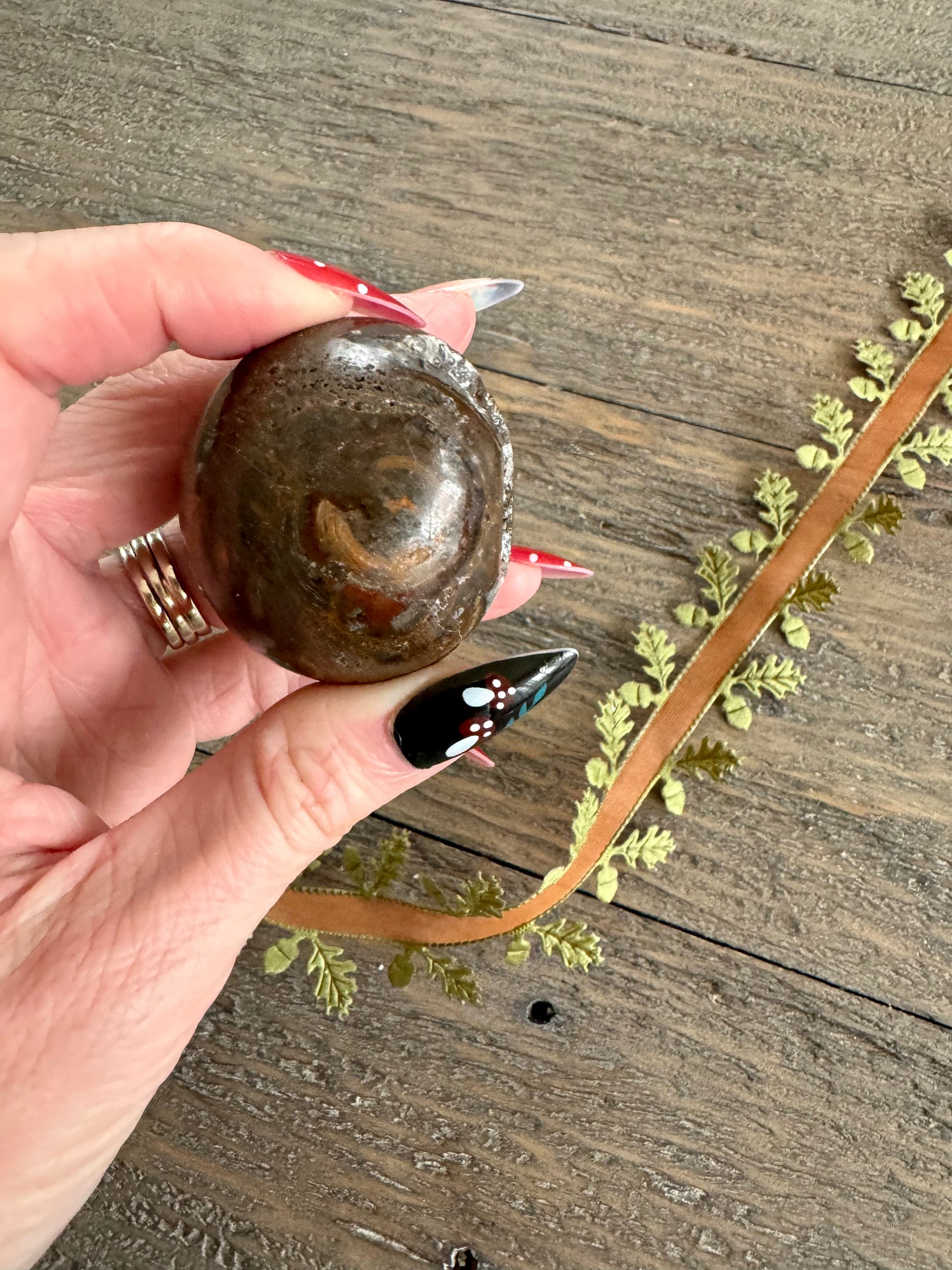 This stunning druzy agate sphere is a natural work of art, swirled with rich shades of brown, caramel, and cream that ground you in the beauty of the earth. At its heart, a sparkling druzy slit reveals a hidden glimmer—like a secret treasure waiting to be discovered. Each piece is one-of-a-kind, radiating warmth, stability, and a quiet kind of magic. Displayed on a tiny gold mini stand, it’s the perfect blend of elegance and grounding energy, making it a beautiful addition to your sacred space, desk, or crystal collection.