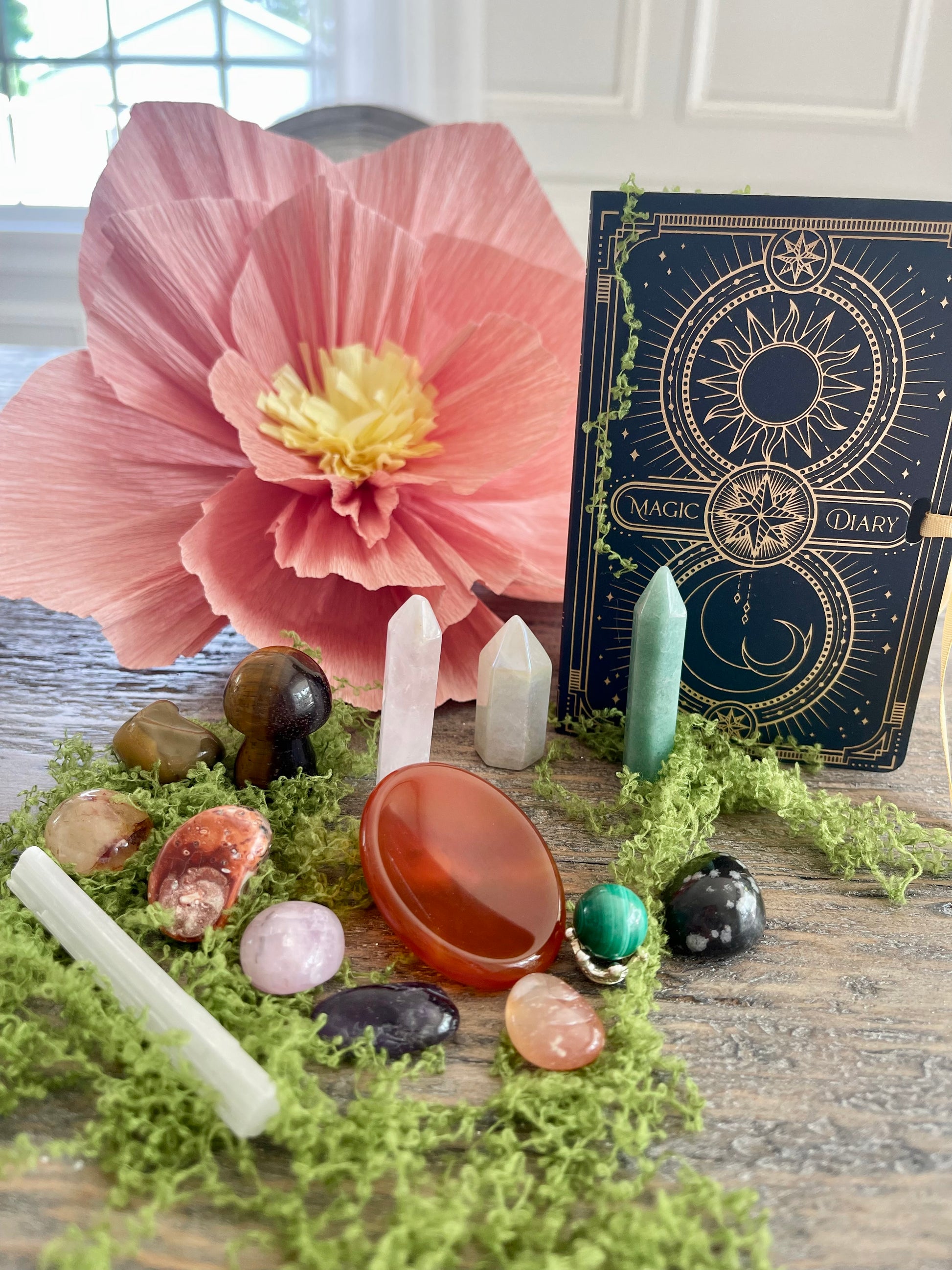 mini towers of aura clear quartz, rose quartz, and snowflake obsidian tumble, carnelian worry stone, mini satin spar stick, amethyst tumble, mini green aventurine tower, and mini malachite sphere with a crown stand all in an adorable box! Additional tumbles: fire quartz, kunzite, mookaite jasper, and flower agate!