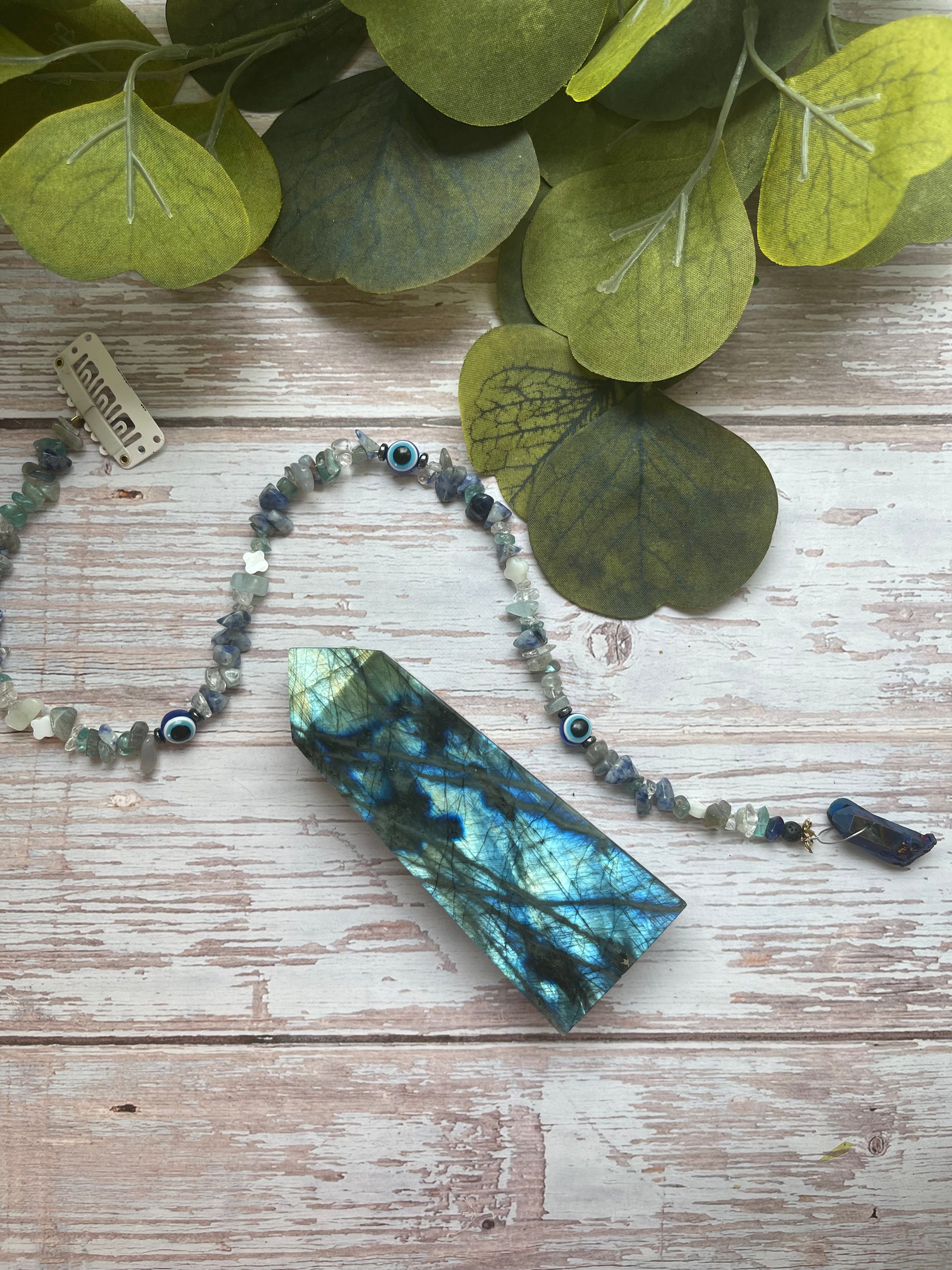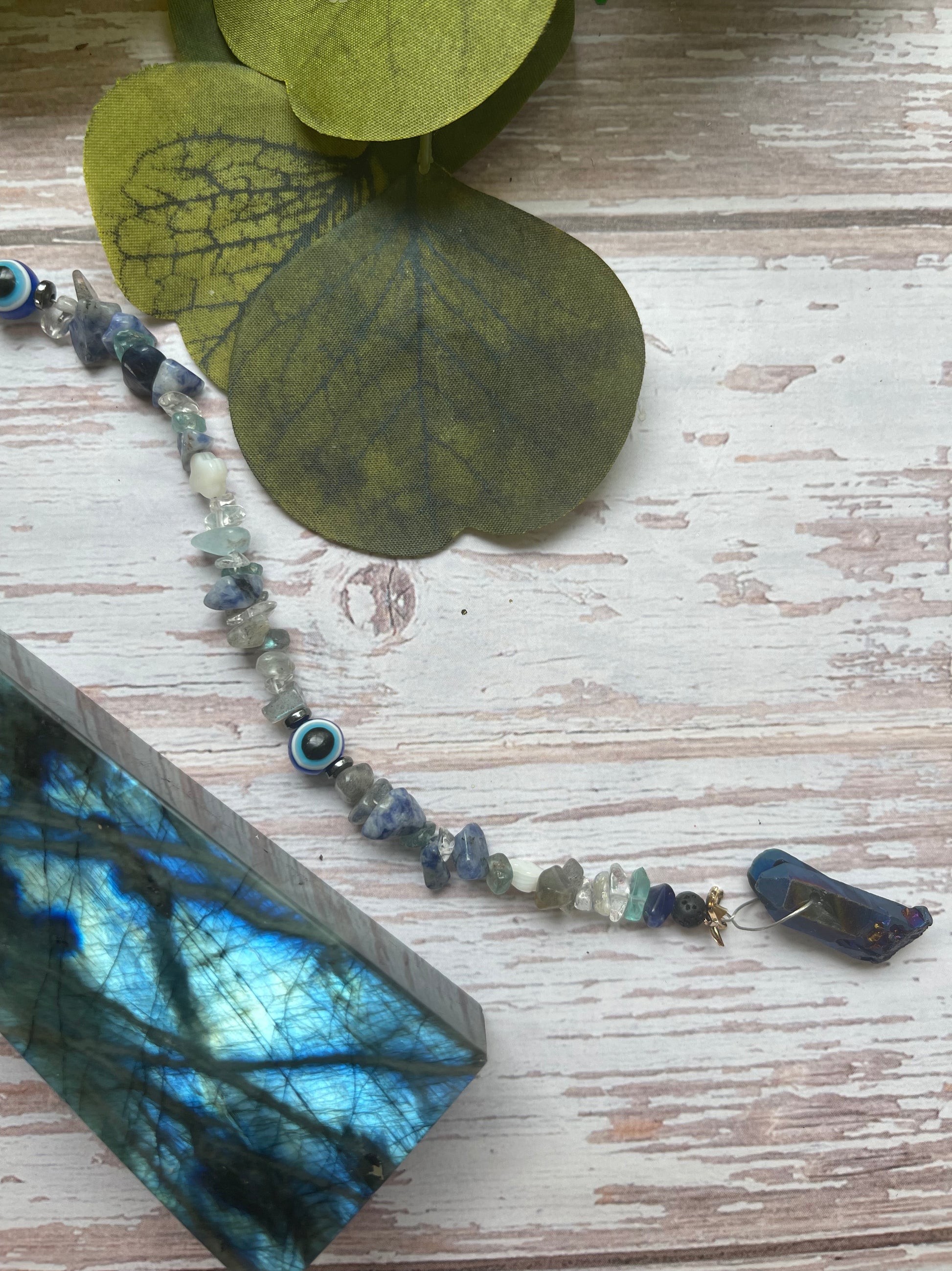Each Evil Eye Hair Extension is handmade personally by me and includes Lava Stone - Sodalite - Clear Quartz -Evil Eye Beads-Shell-Blue Apatite-Labradorite-Blue Aura Clear Quartz Point . Great for protection! Each will always include the crystals listed.