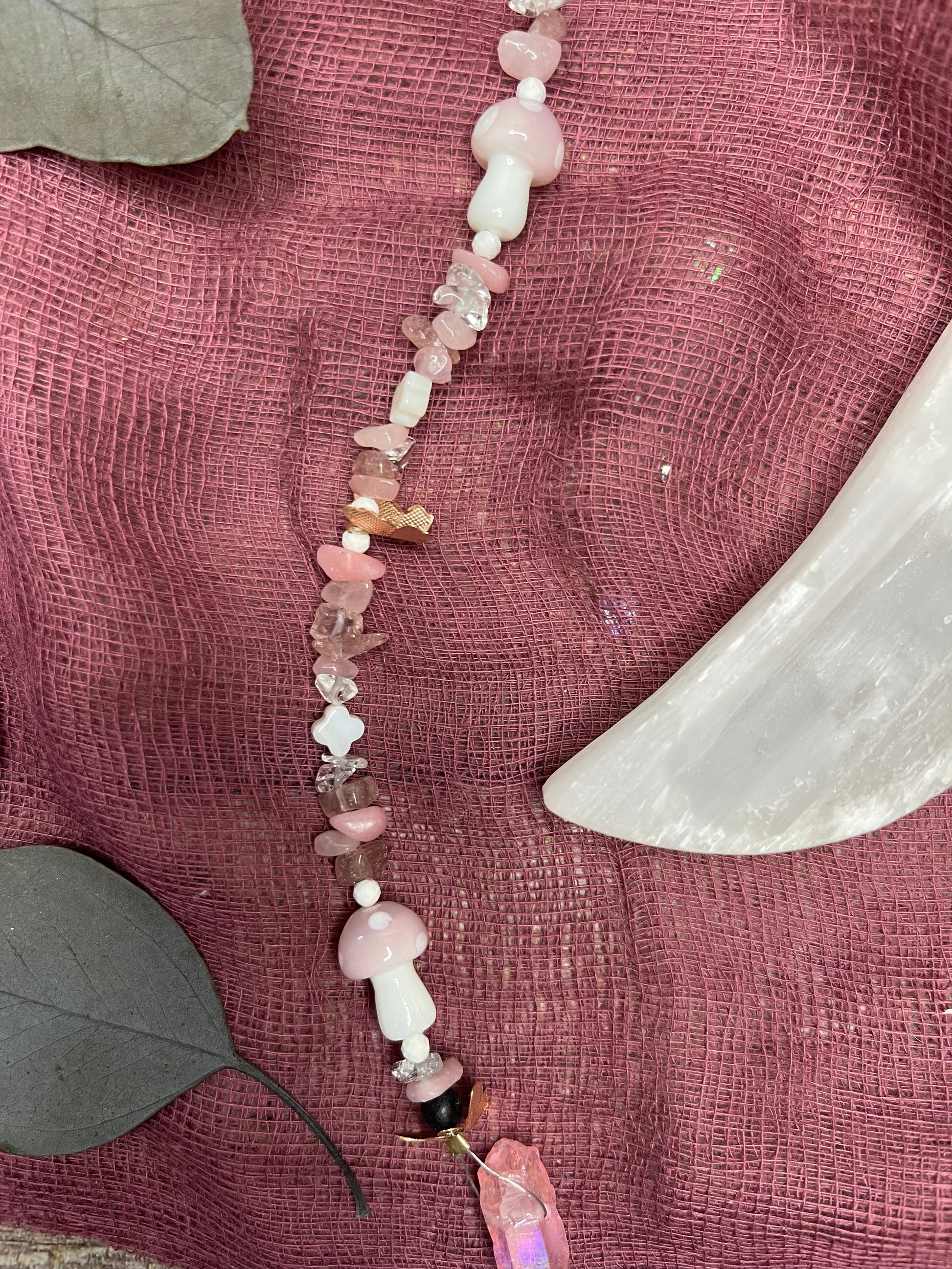 Crystals: Lava Stone, Rose Quartz, Clear Quartz, Howlite, Shell (white flower-like bead), and Angel Aura Rose Quartz Crystal Point.