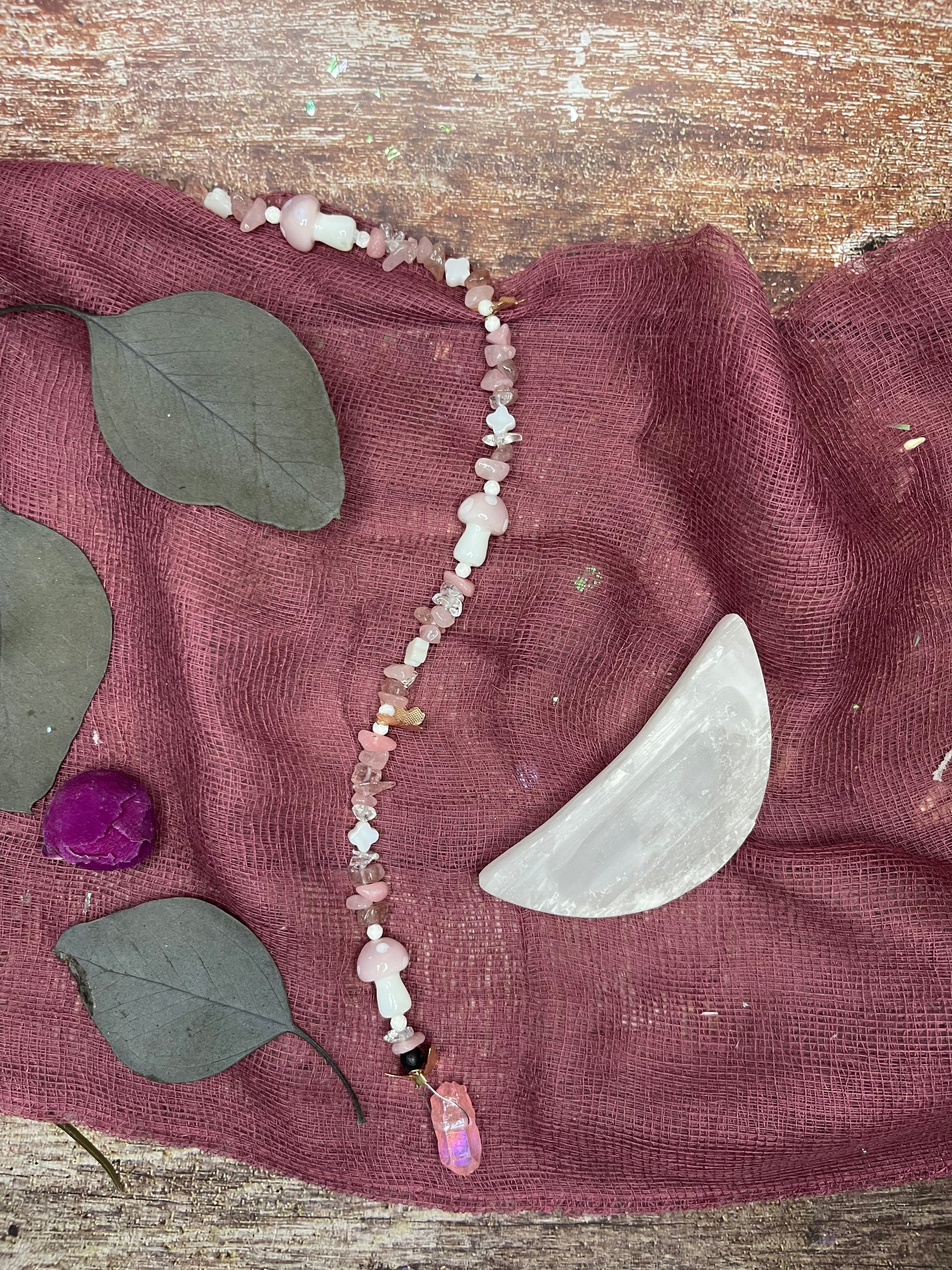 Crystal hair extensions are a perfect way to keep your healing crystals on you. Each extension has a lava stone on it to put your favorite essential order or perfume to keep your hair smelling great. Extensions can be worn with your hair up or down. How adorable is this extension? The beautiful crystals are combined with a glass baby pink mushroom bead and gold butterfly charms. Total fairy vibes!