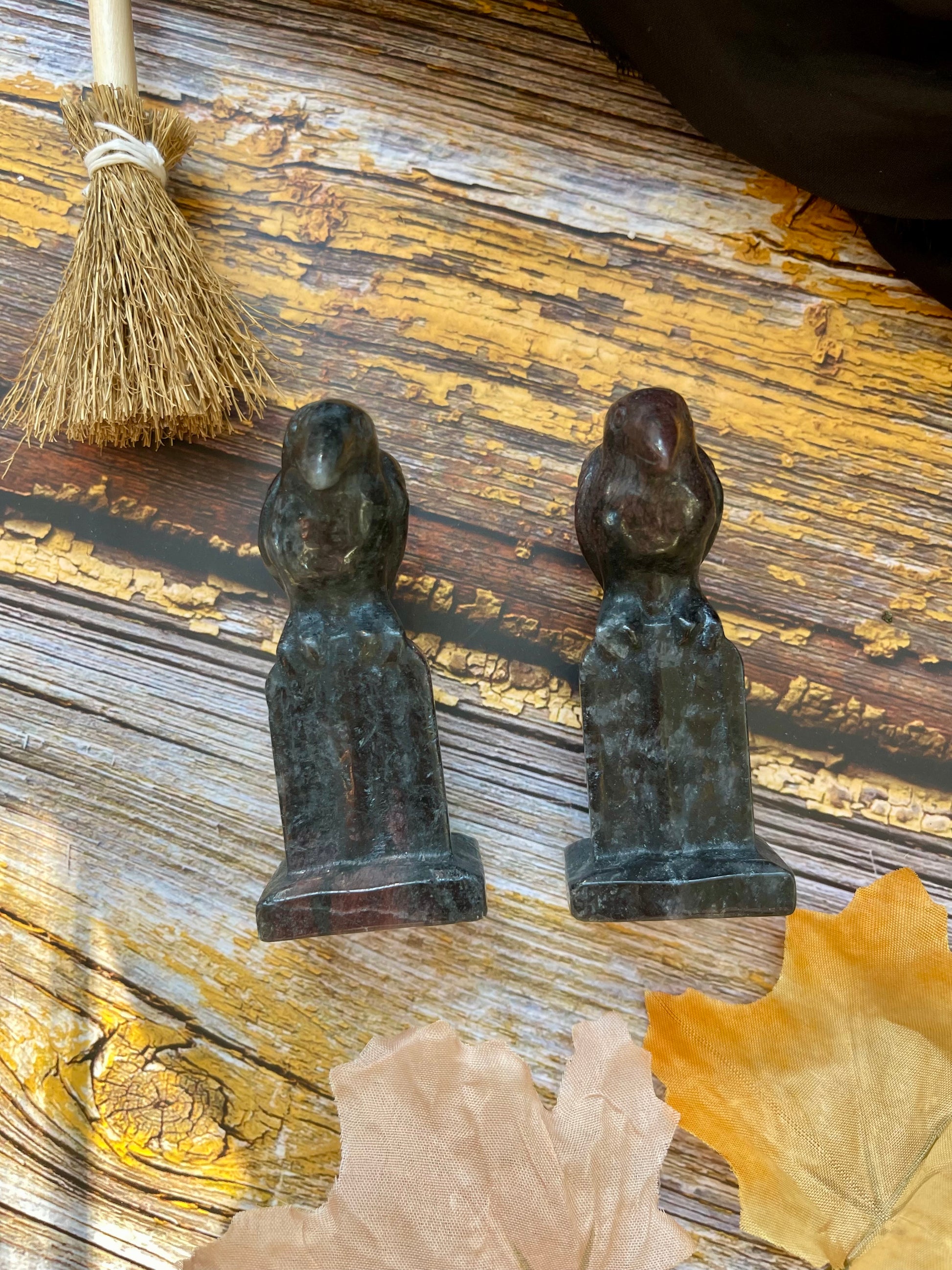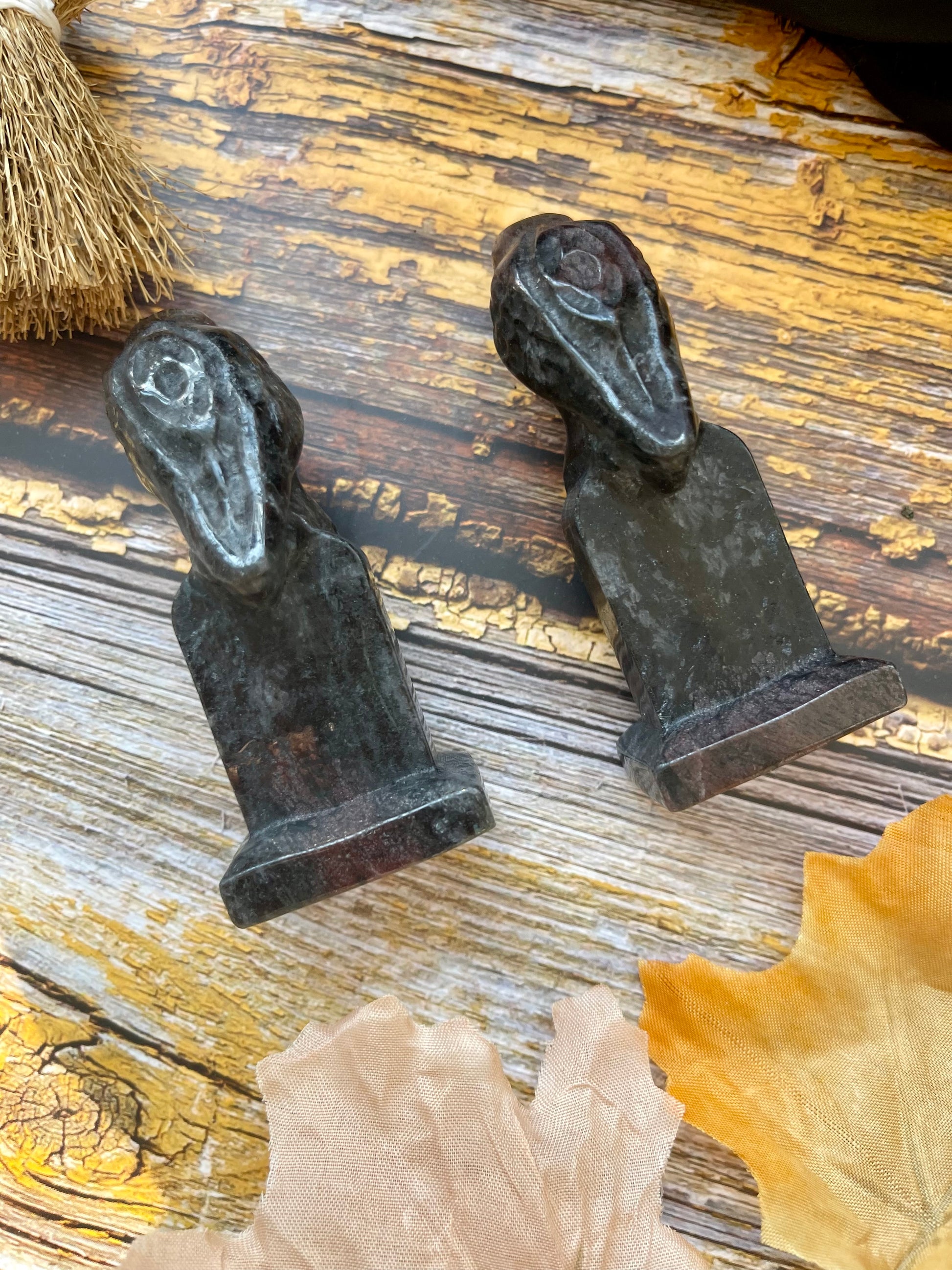 This Grave Raven features a striking raven made of garnet, perched atop a beautifully crafted gravestone. A perfect addition to any gothic or Halloween collection.