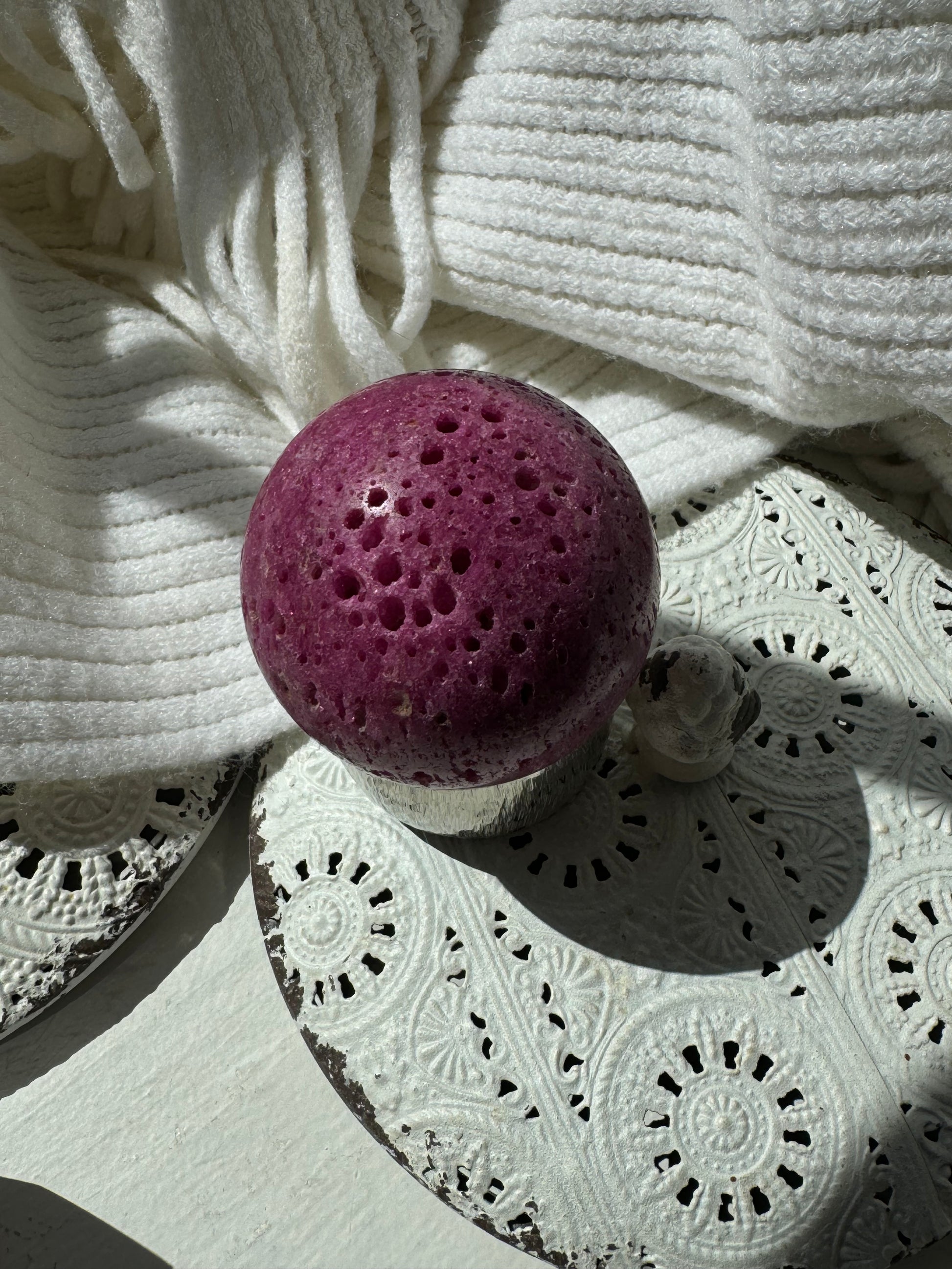 This mesmerizing honeycomb ruby sphere is a true showstopper, with its deep magenta glow and intricate honeycomb pattern that catches the light in the most enchanting way. While I don’t typically lean toward man-made crystals, this one is a rare exception—and once you hold it, you’ll understand why.