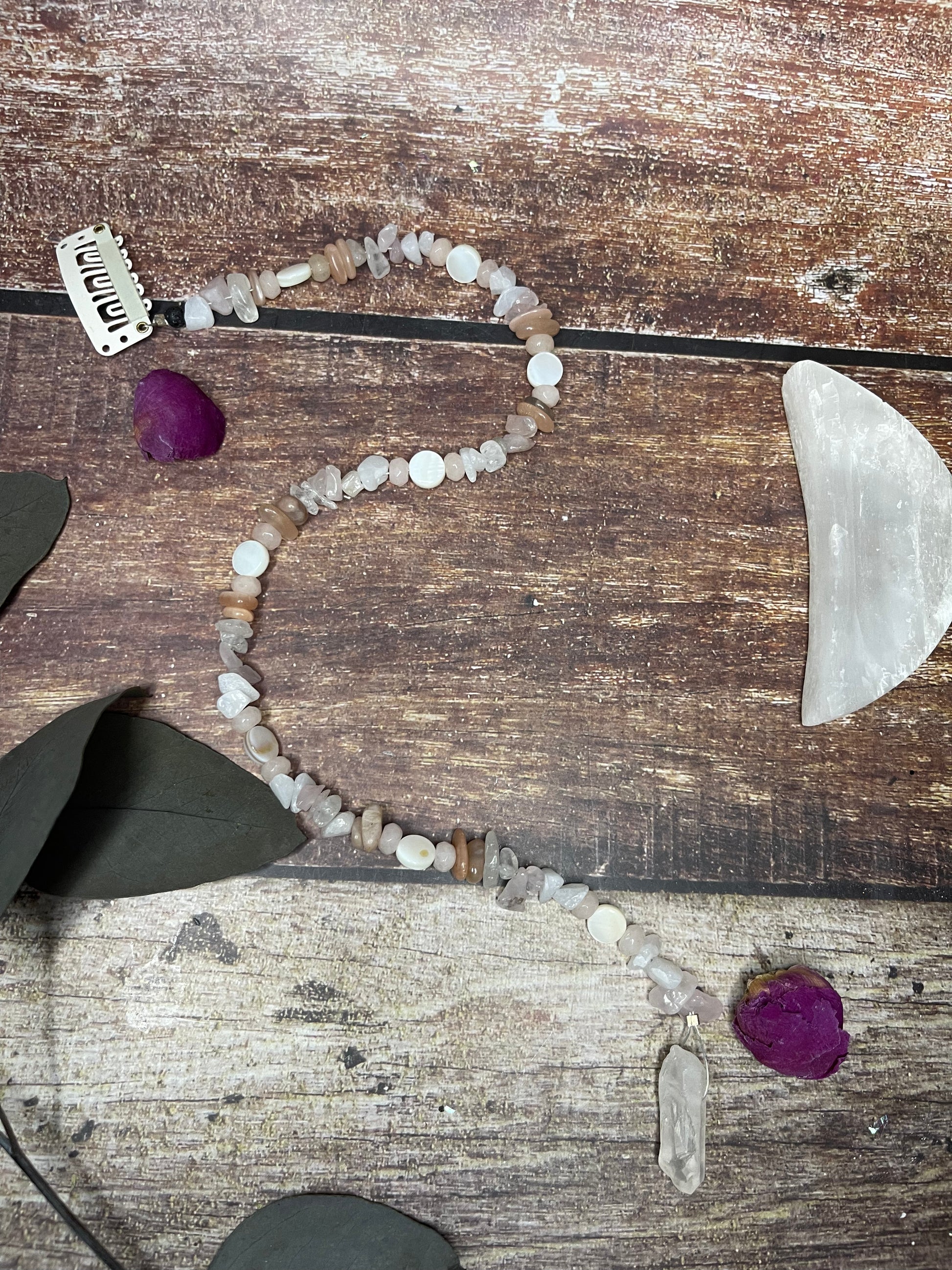 Crystals: Lava Stone, Rose Quartz, Clear Quartz, Sunstone, Shell (white bead), and Clear Quartz Crystal Point.
