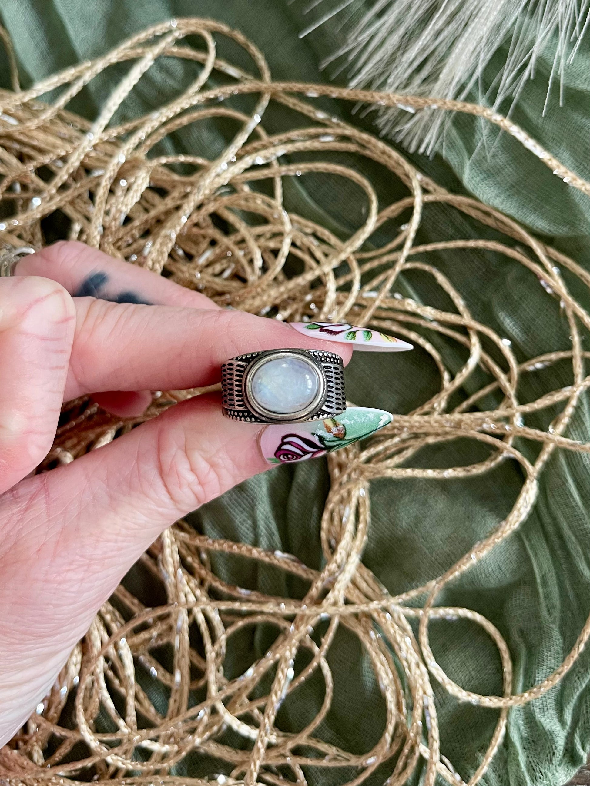 Get in touch with the mystical powers of the Moon with our Moonstone Adjustable Ring. Made of white copper, this flashy ring not only adds style to your look, but also has healing properties. A must-have for any crystal enthusiast! Moonstone has a very calming energy and helps with intuition.
