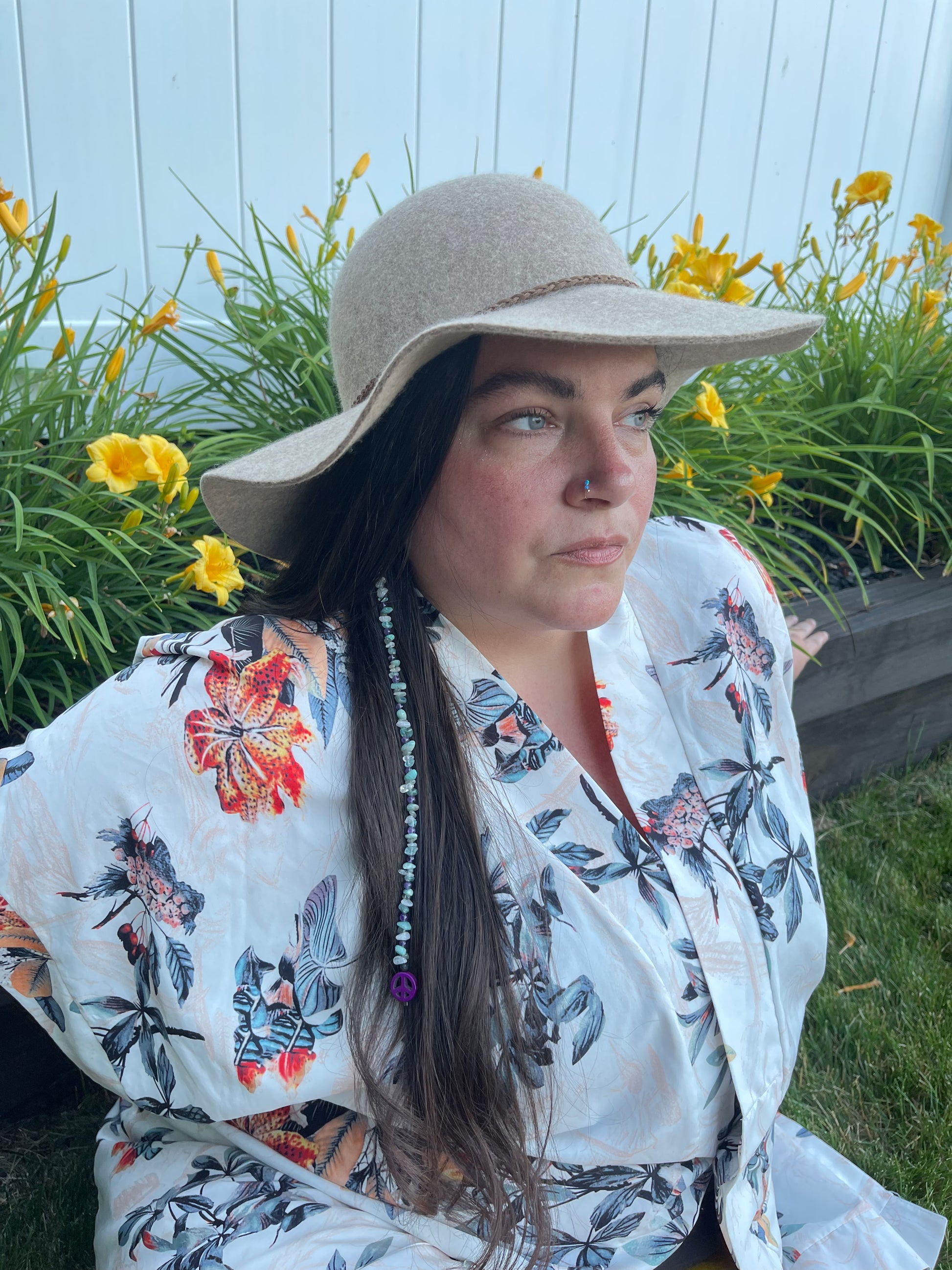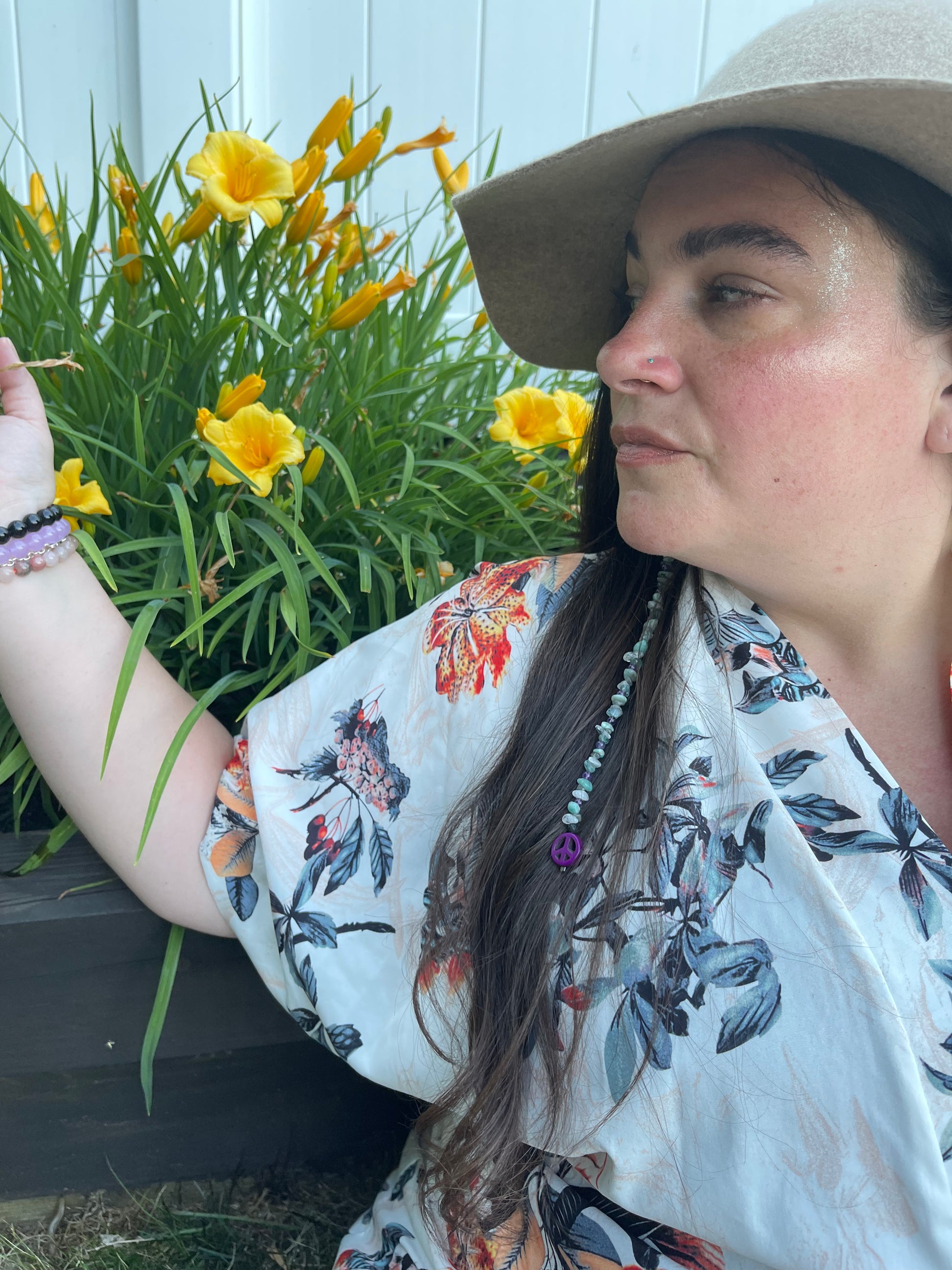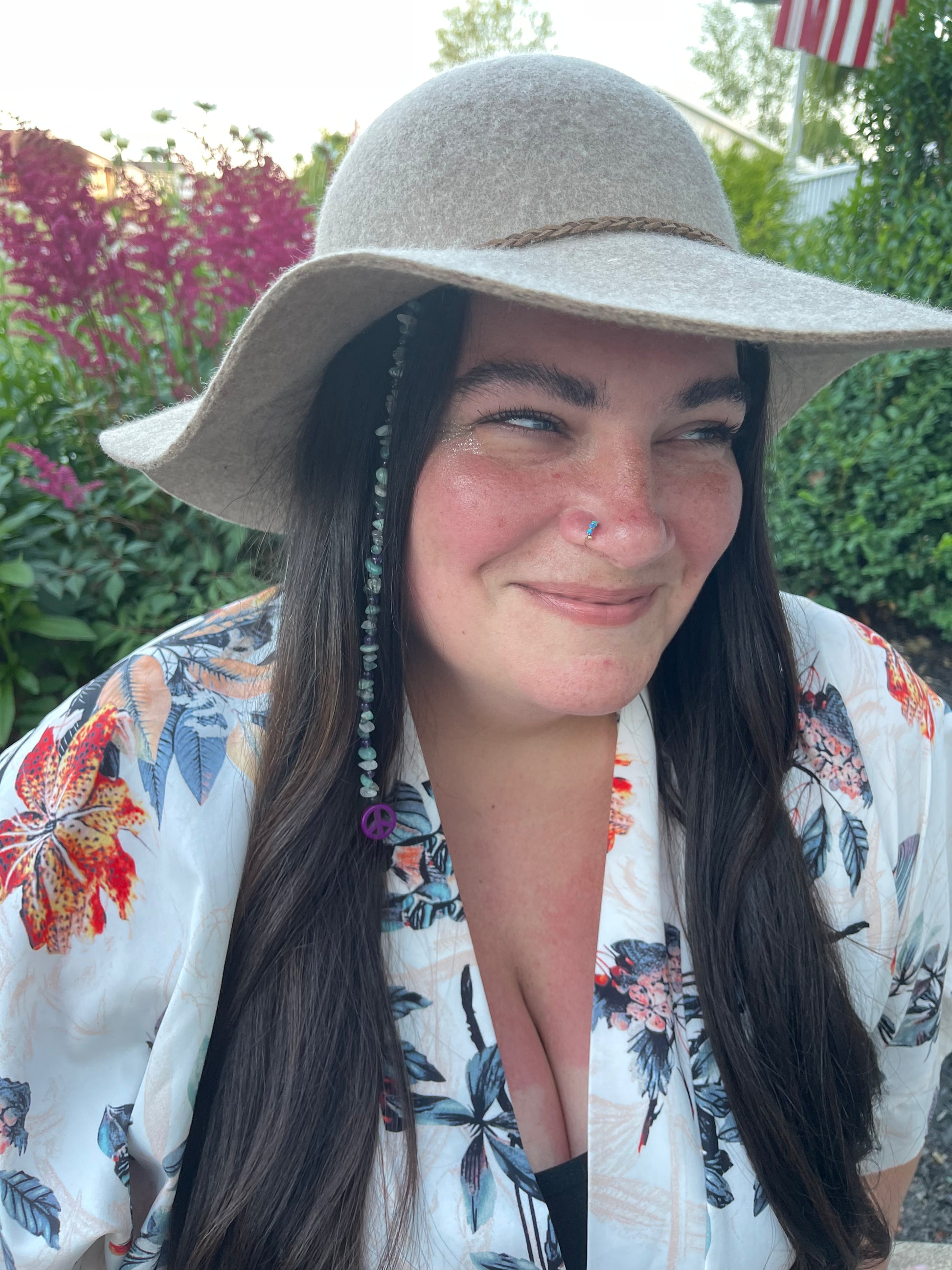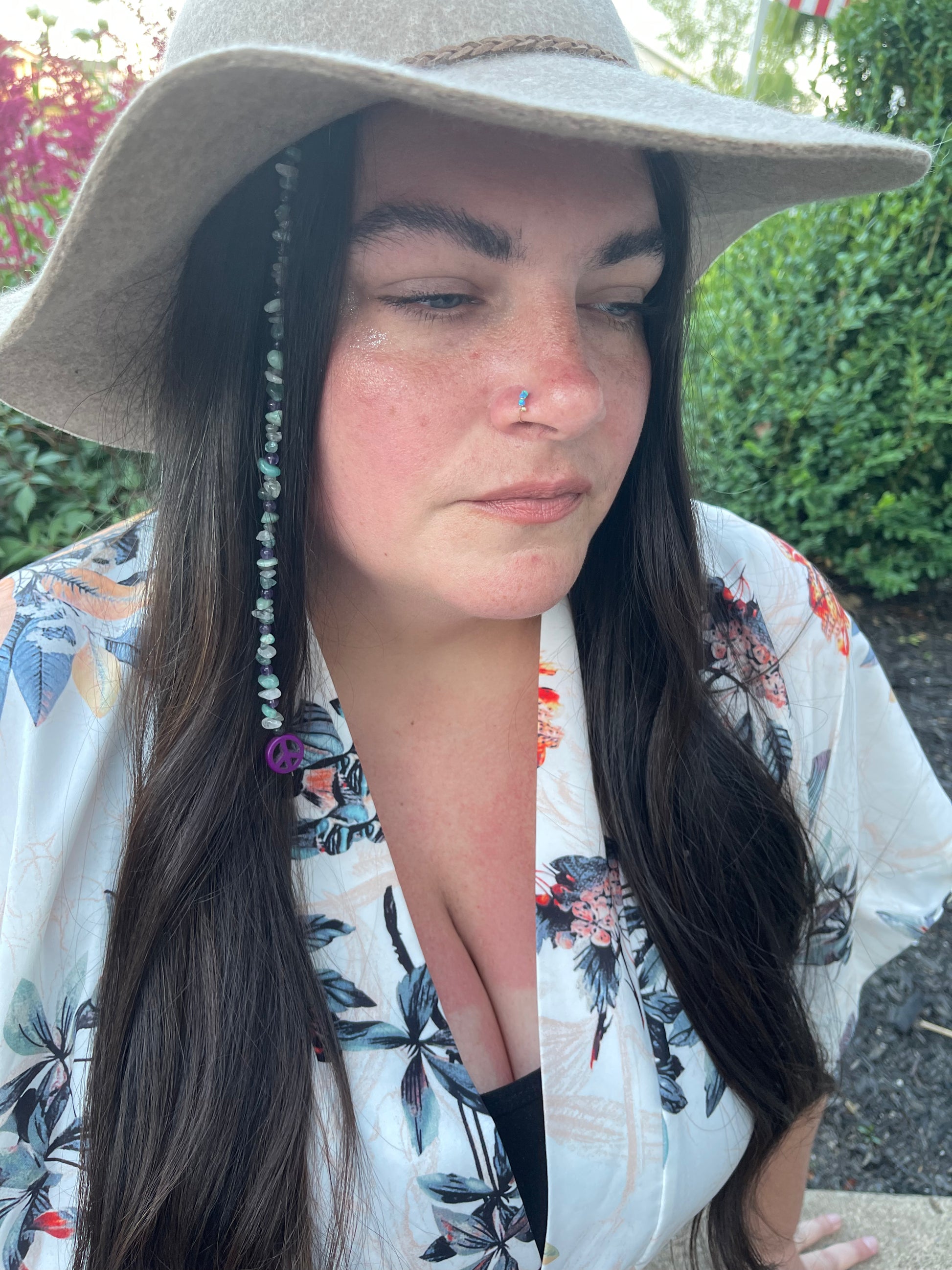 Each Peace Crystal Hair Extension is handmade personally by me and includes Lava Stone -Blue Apatite - Round Amethyst - Amazonite- Labradortie - Clear Quartz - Clay Peace Sign (color will vary between white, green, yellow blue, or purple)