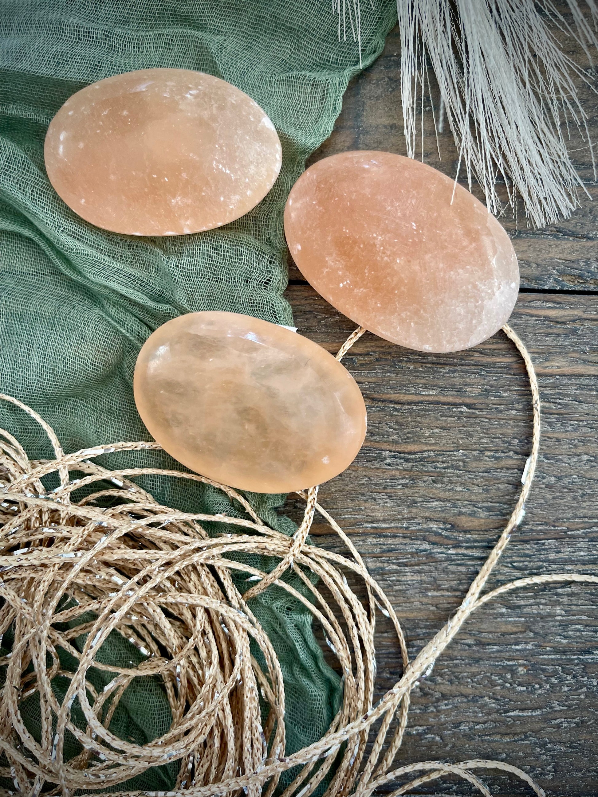 Experience the warm and nurturing energy of our Peach Satin Spar (Selenite) Palm Stones. This variety of selenite has a beautiful peach hue, representing positive energy and emotional healing. Used in crystal healing, it offers the same cleansing properties of regular selenite with added feelings of warmth, acceptance, and self-love.