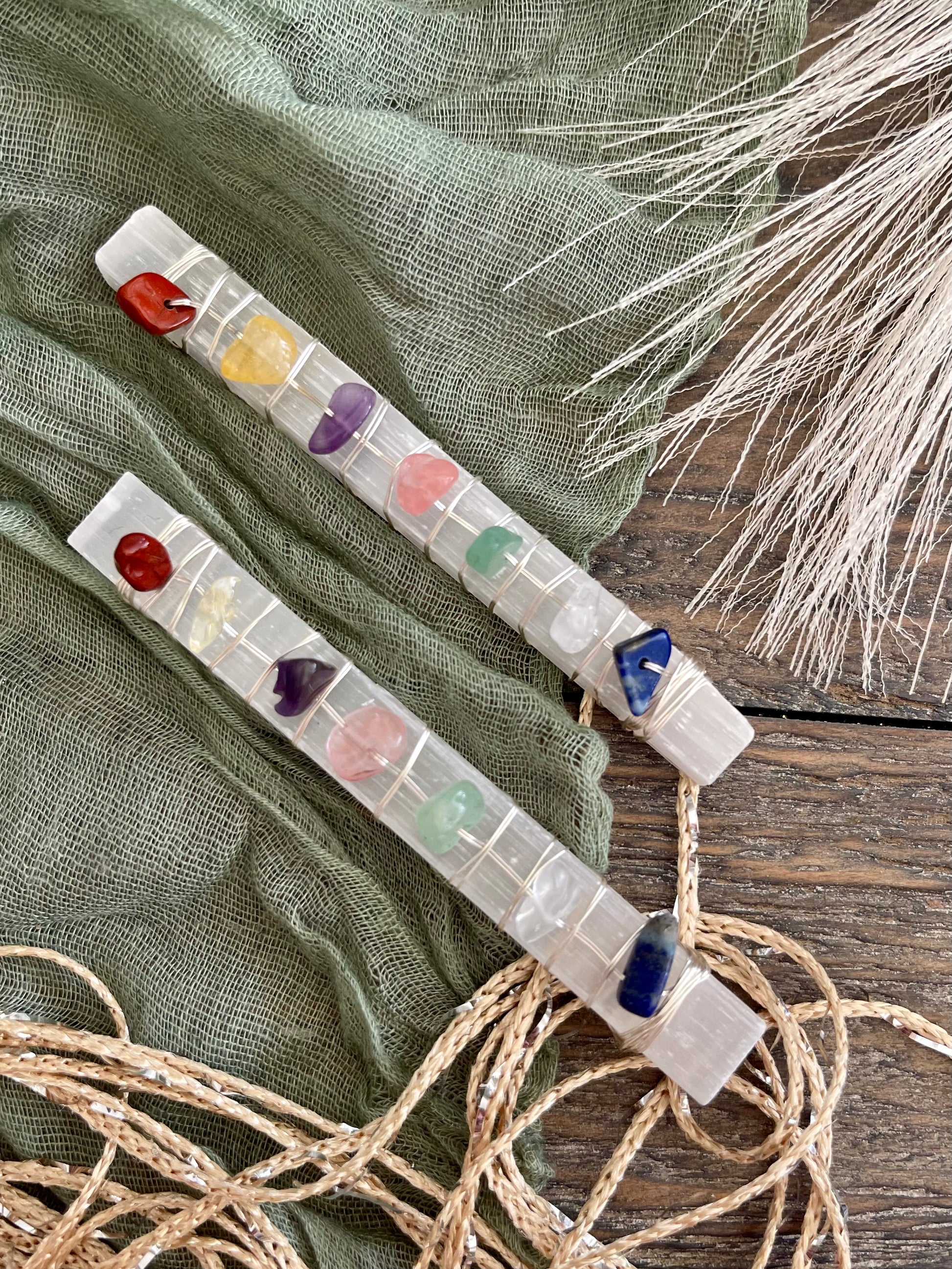 Experience the power of this luxurious Selenite Wand, enhanced with Chakra Crystal Chips weaved down the center and wire wrapped for a sophisticated touch. Feel the healing properties of Selenite as you elevate your spiritual journey. Elevate your energy and embrace balance with each use. Selenite is great at cleaning out negative energy and charging your crystals, a space, or even you with positive vibes.