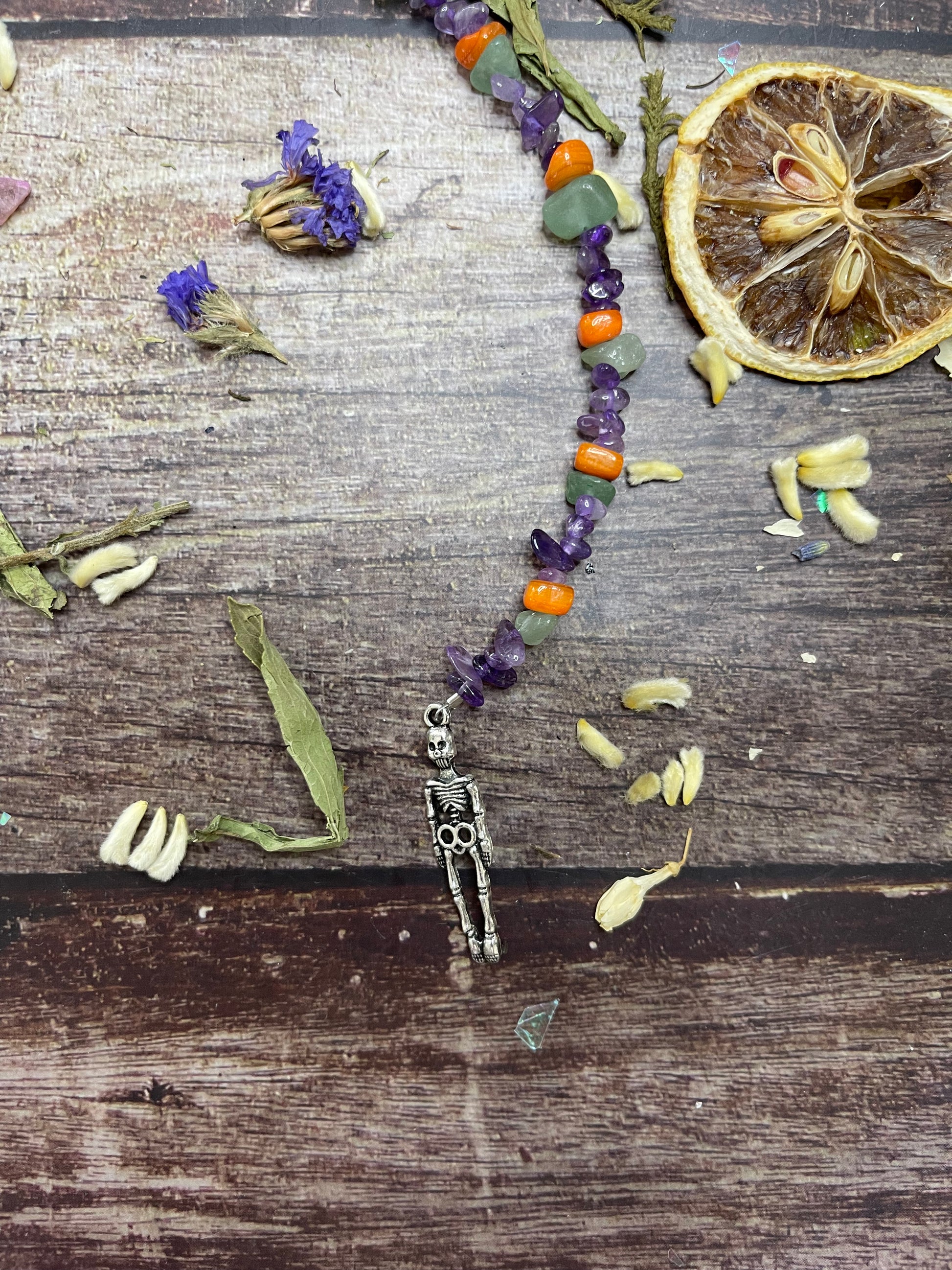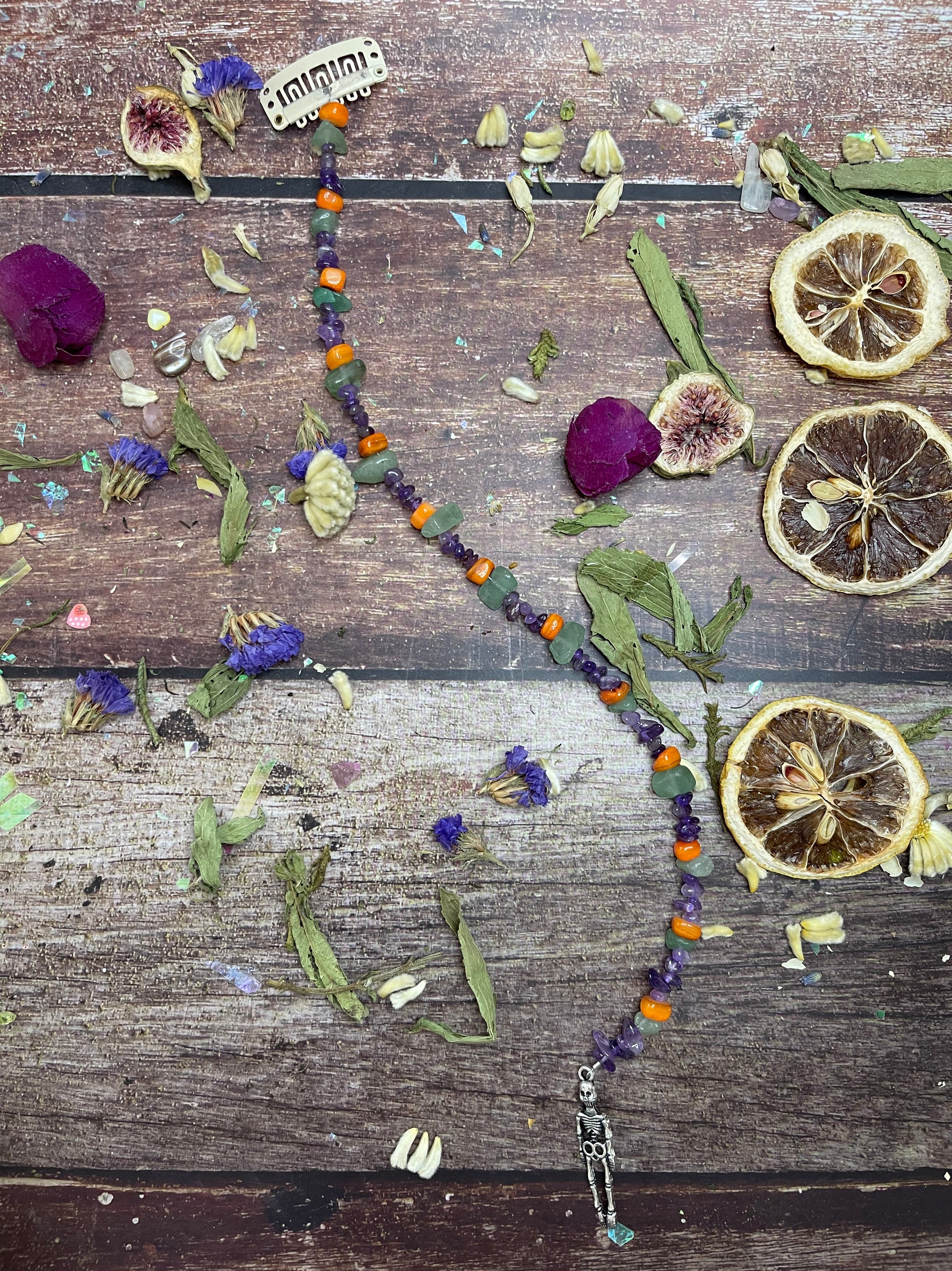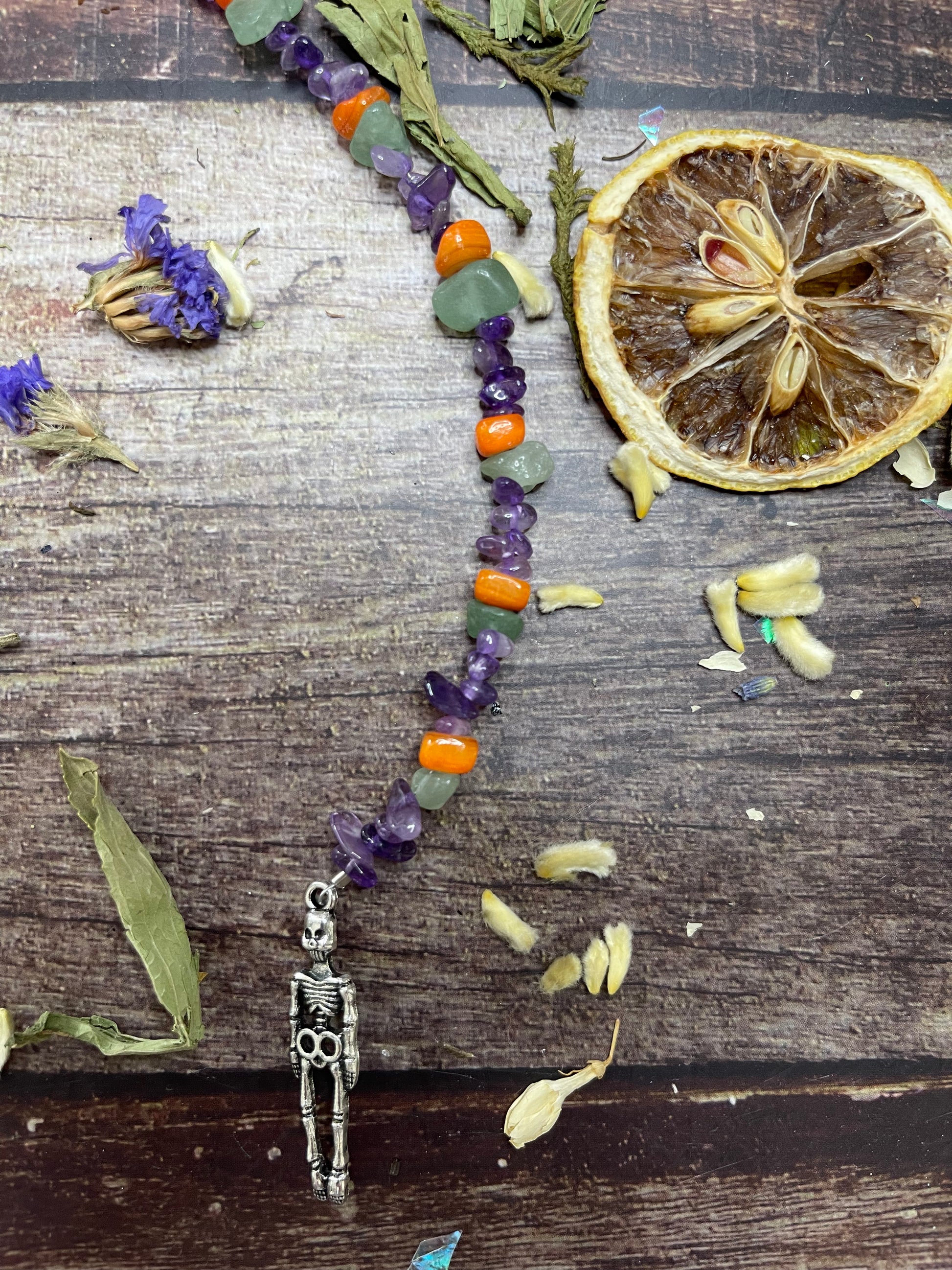 Crystals: Lava Stone, Amethyst, Dyed Orange Shell, Green Aventurine, Skeleton Charm