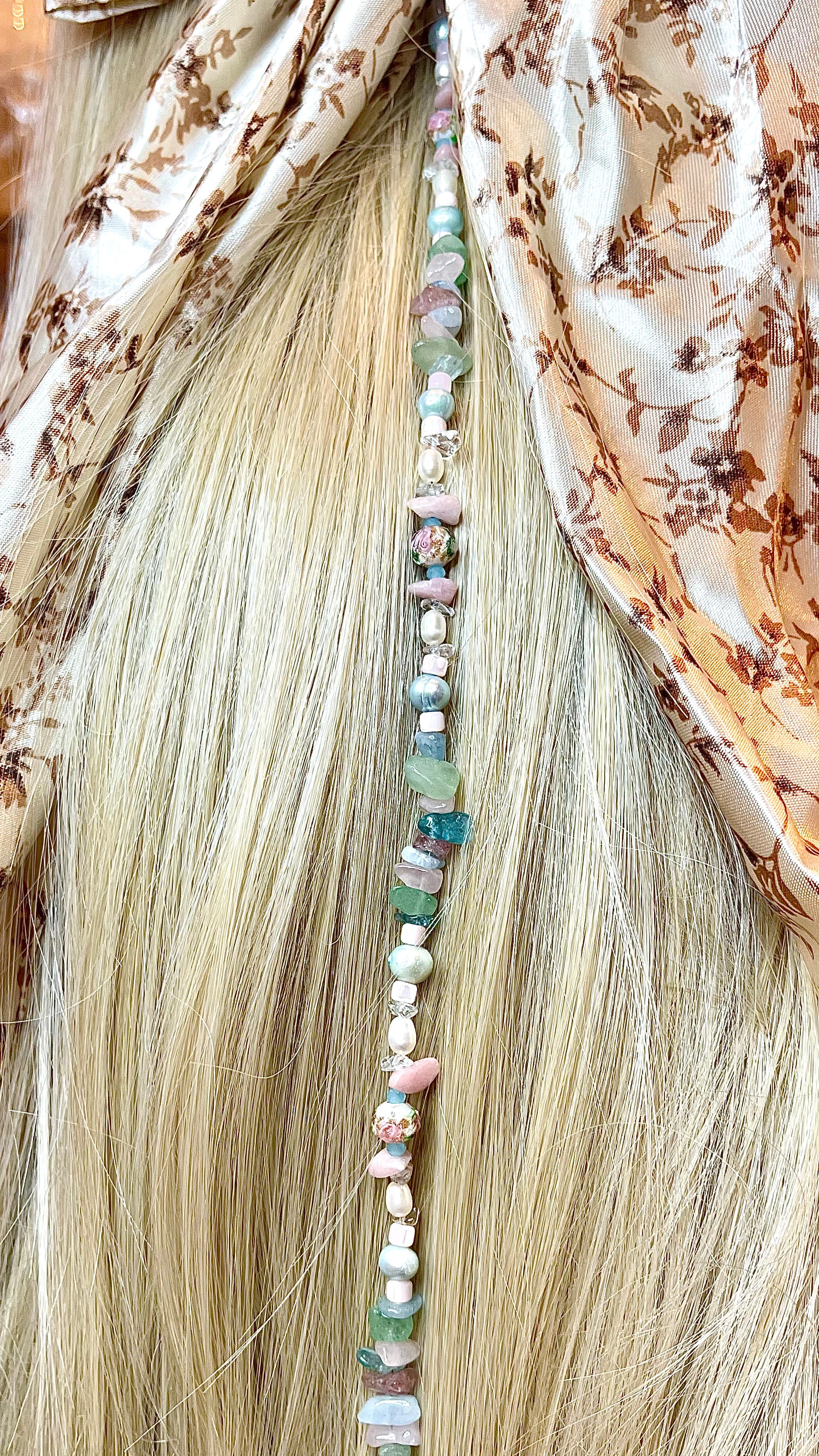 Crystal hair extensions are a perfect way to keep your healing crystals on you. Each extension has a lava stone on it to put your favorite essential order or perfume to keep your hair smelling great. Extensions can be worn with your hair up or down. This is one of my all-time favorites! In your Bridgerton area enjoy the feelings of youth, happiness, and love for others and most importantly, yourself!