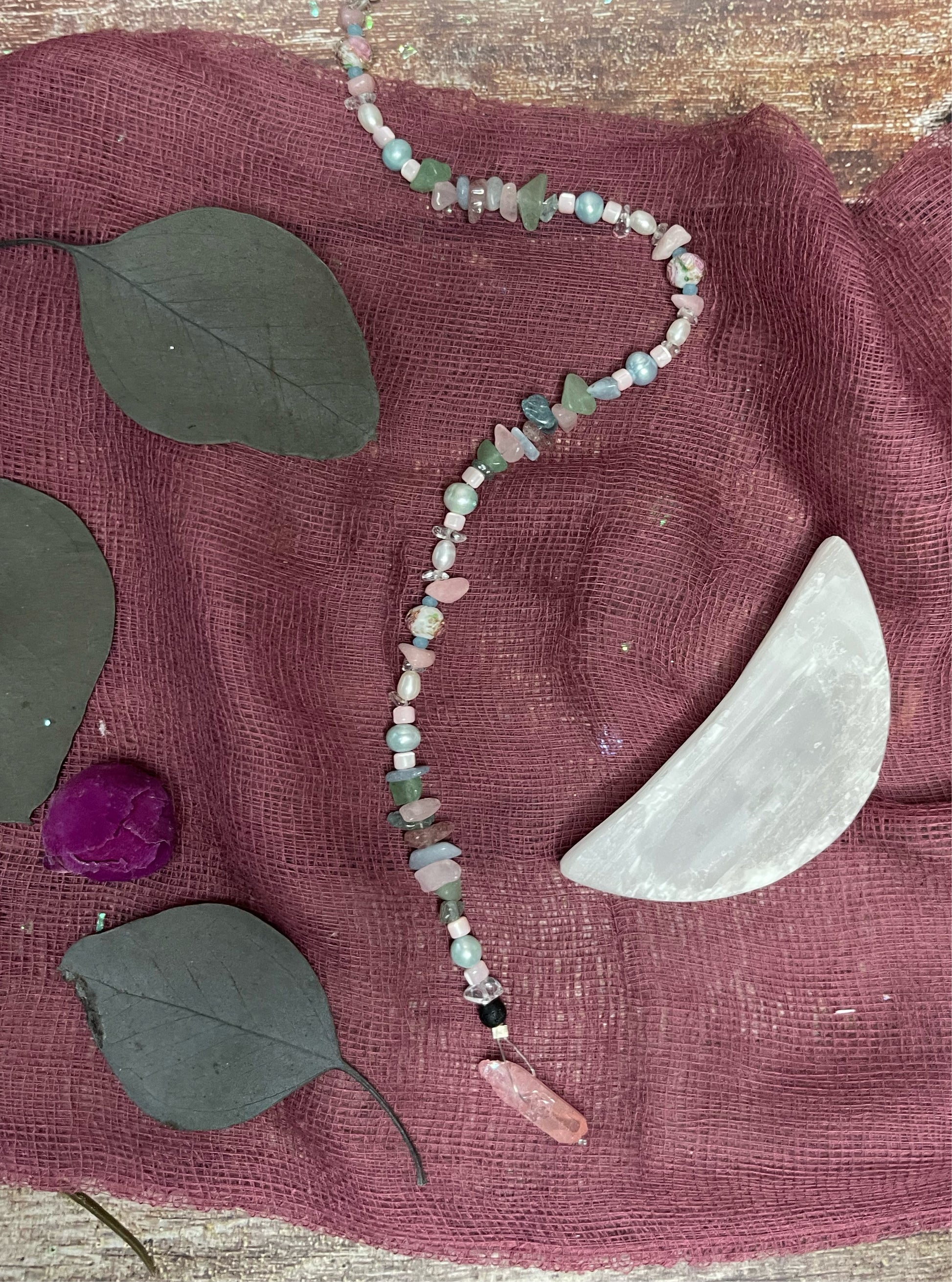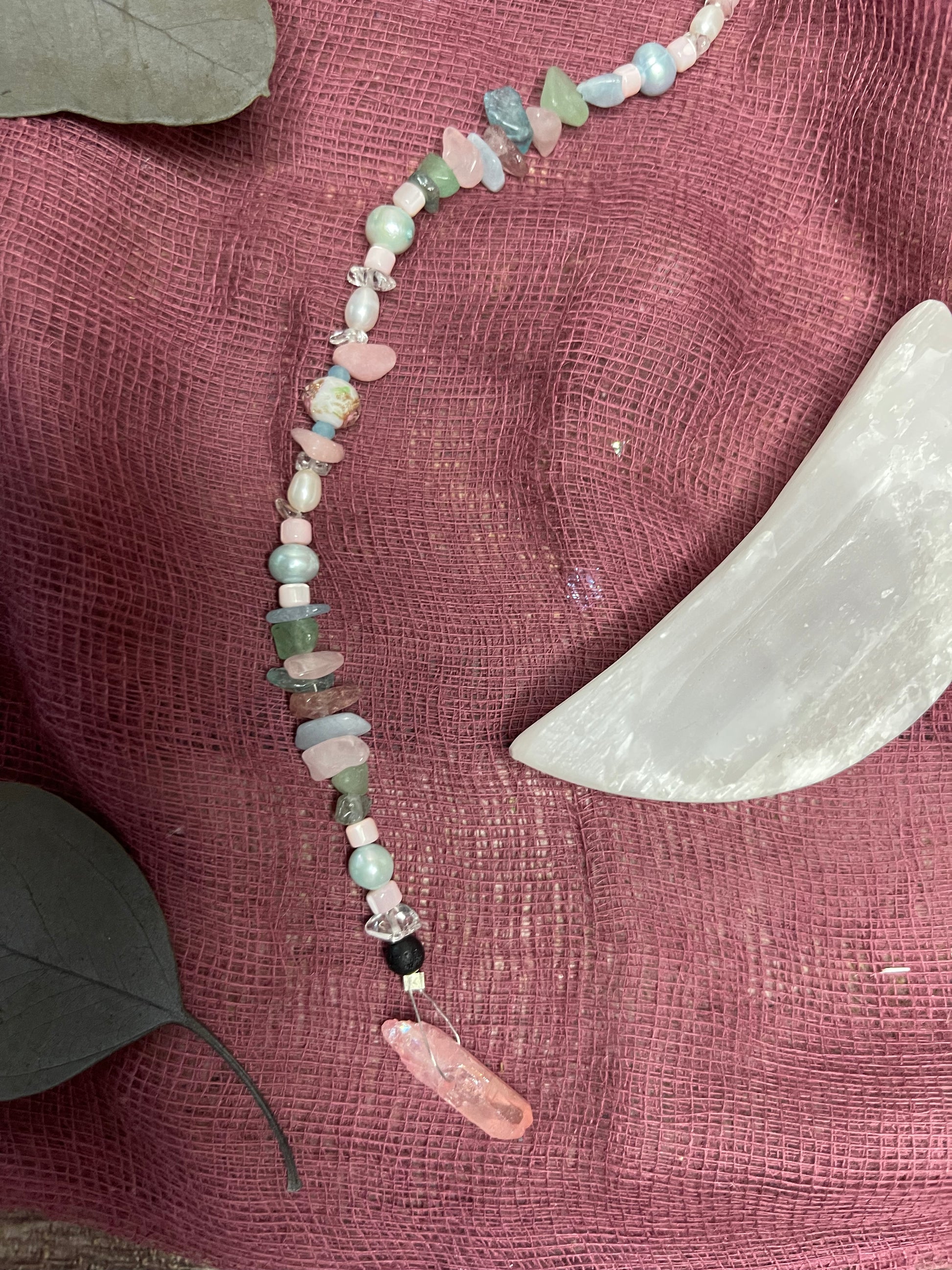 Crystals: Lava Stone, Clear Quartz, Green Aventurine, Shell (small pink bead), Aquamarine or Blue Lace Agate, Pink Opal, Baby Blue Pearl or White Pearl, Glass Floral Bead, and Aura Rose Quartz Crystal Point.